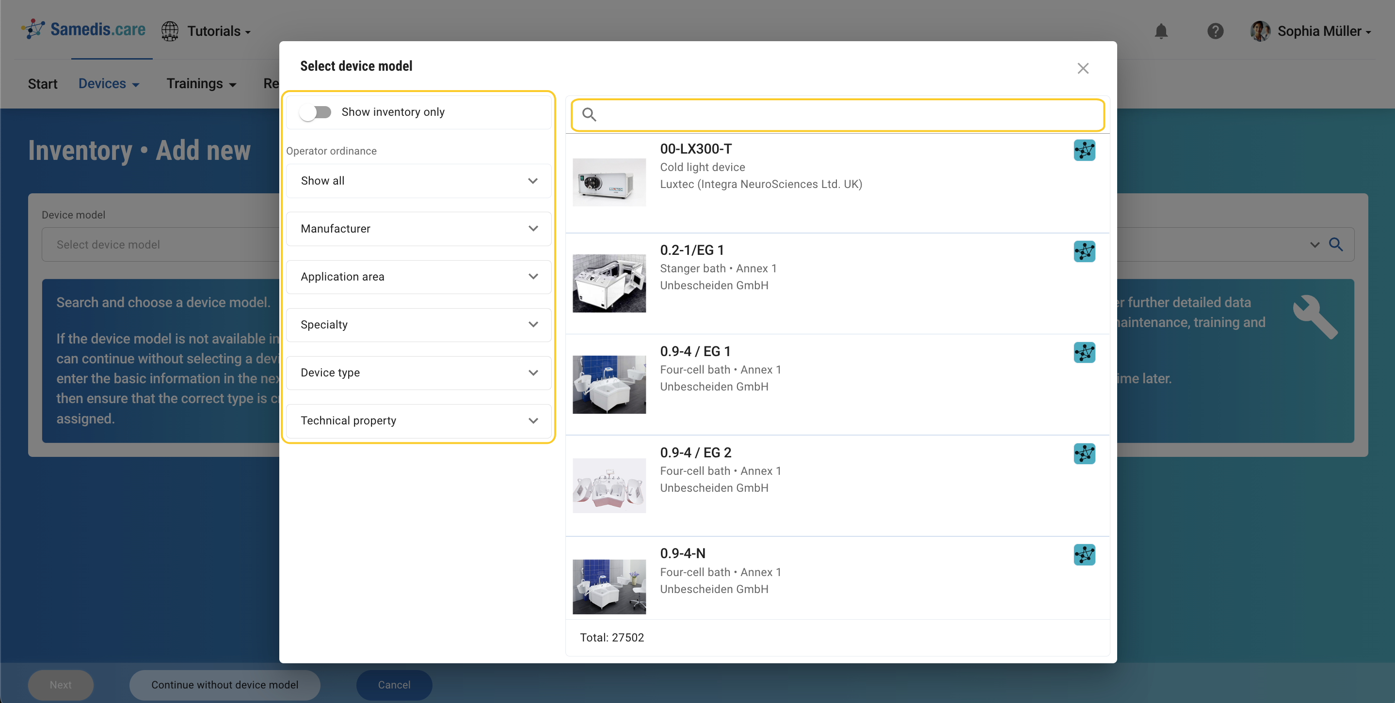 By clicking on the magnifying glass icon 🔍 located to the right of a selection field you can access the advanced search. In the dialog window you can refine your search using keywords and filters.