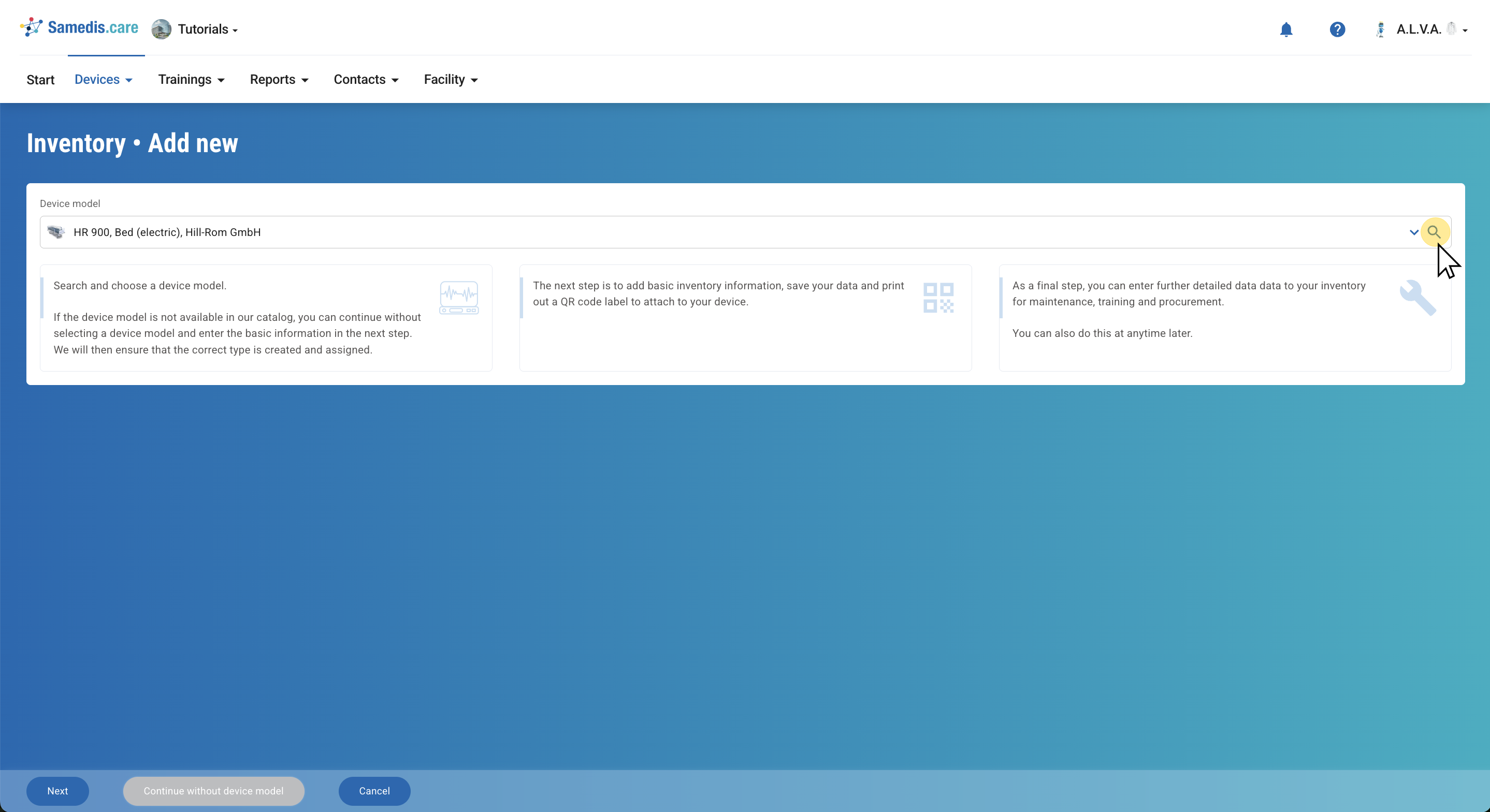 If the device model is not in the catalog, you can proceed without selecting a device type. Click “Continue without device model”. We will then ensure that the correct device model is created and assigned.