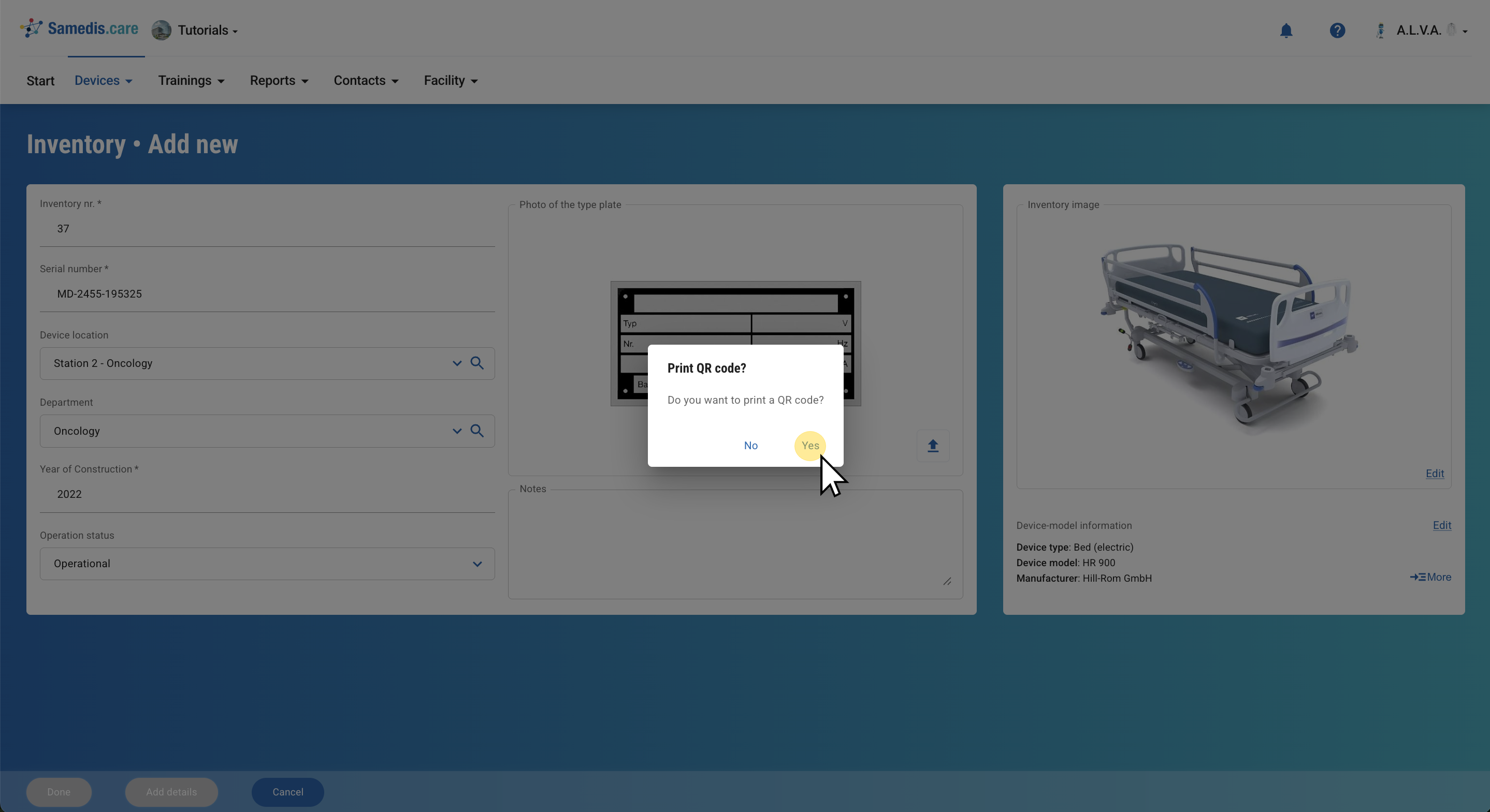 Finally, you have the option to print the QR code associated with the device. Click Yes to print the QR code directly. Alternatively, if you click No, you will be taken to the overview of your devices where you can print the QR code at any time.