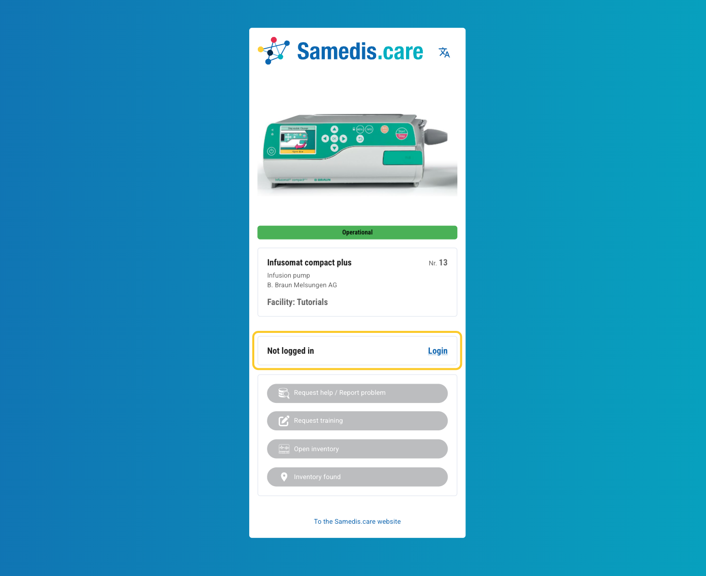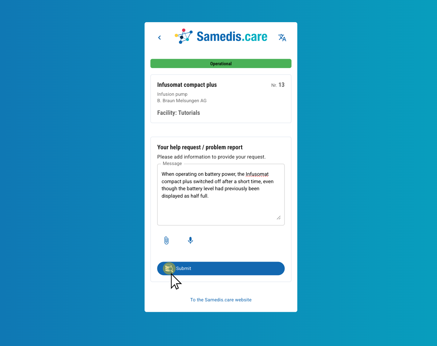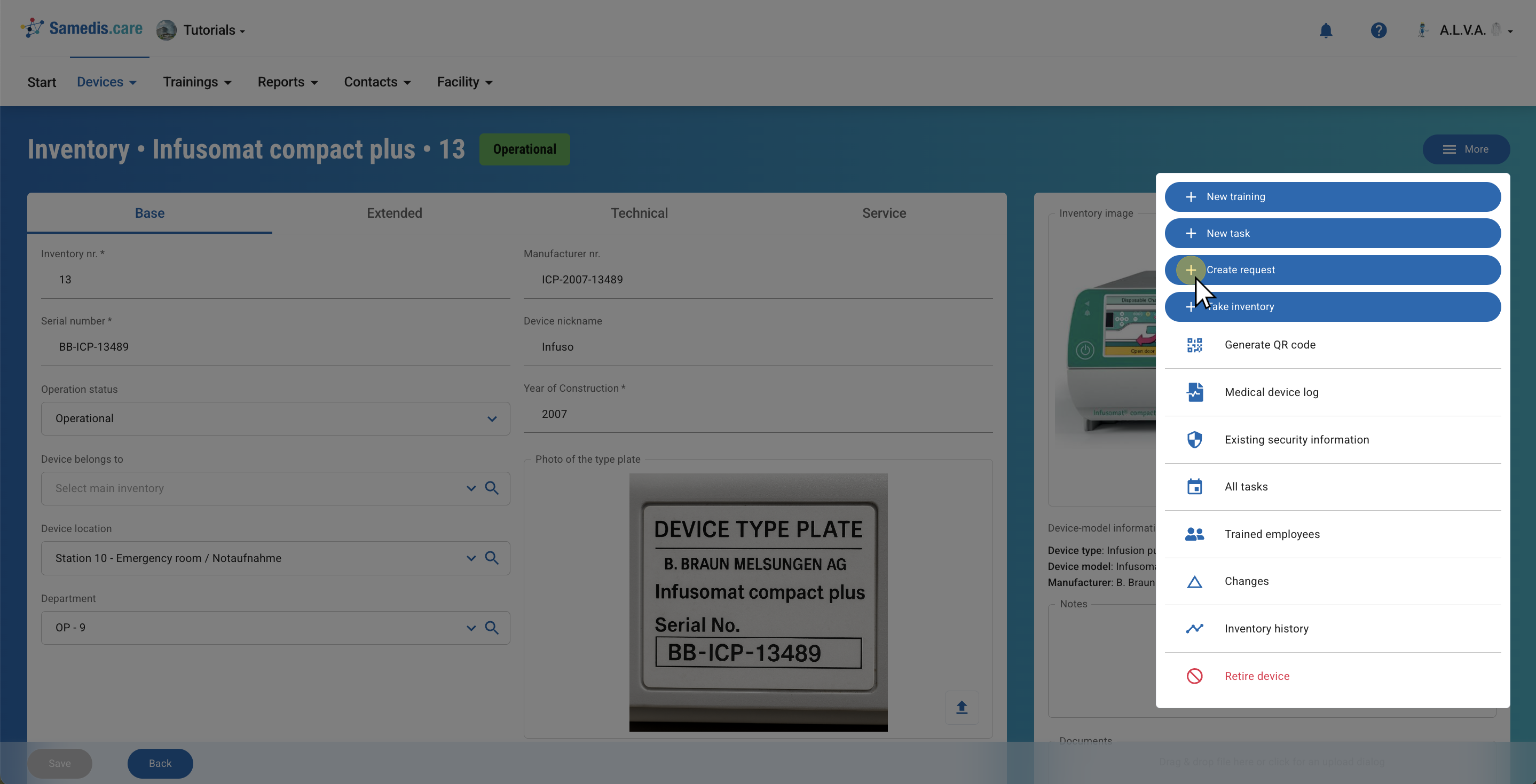 If you do not have a phone or tablet available, you can also create the request on a computer. In Samedis.care, go to the device details and, in the device’s detail view, use the Create request function under More.
