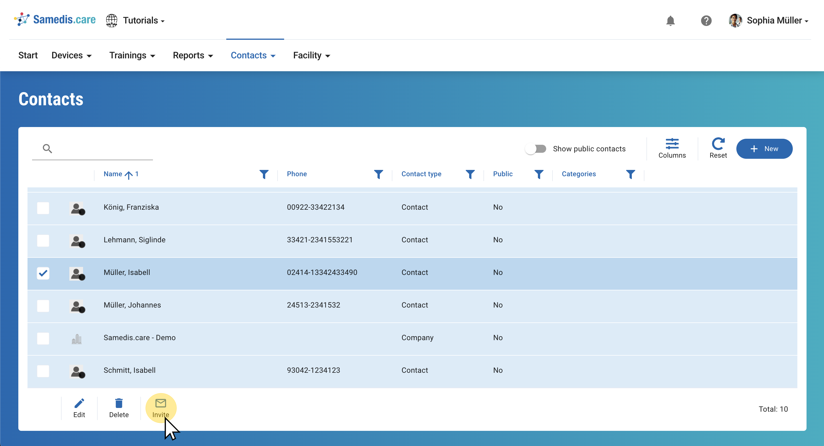 To do so, select the designated contact person and click on Invite.