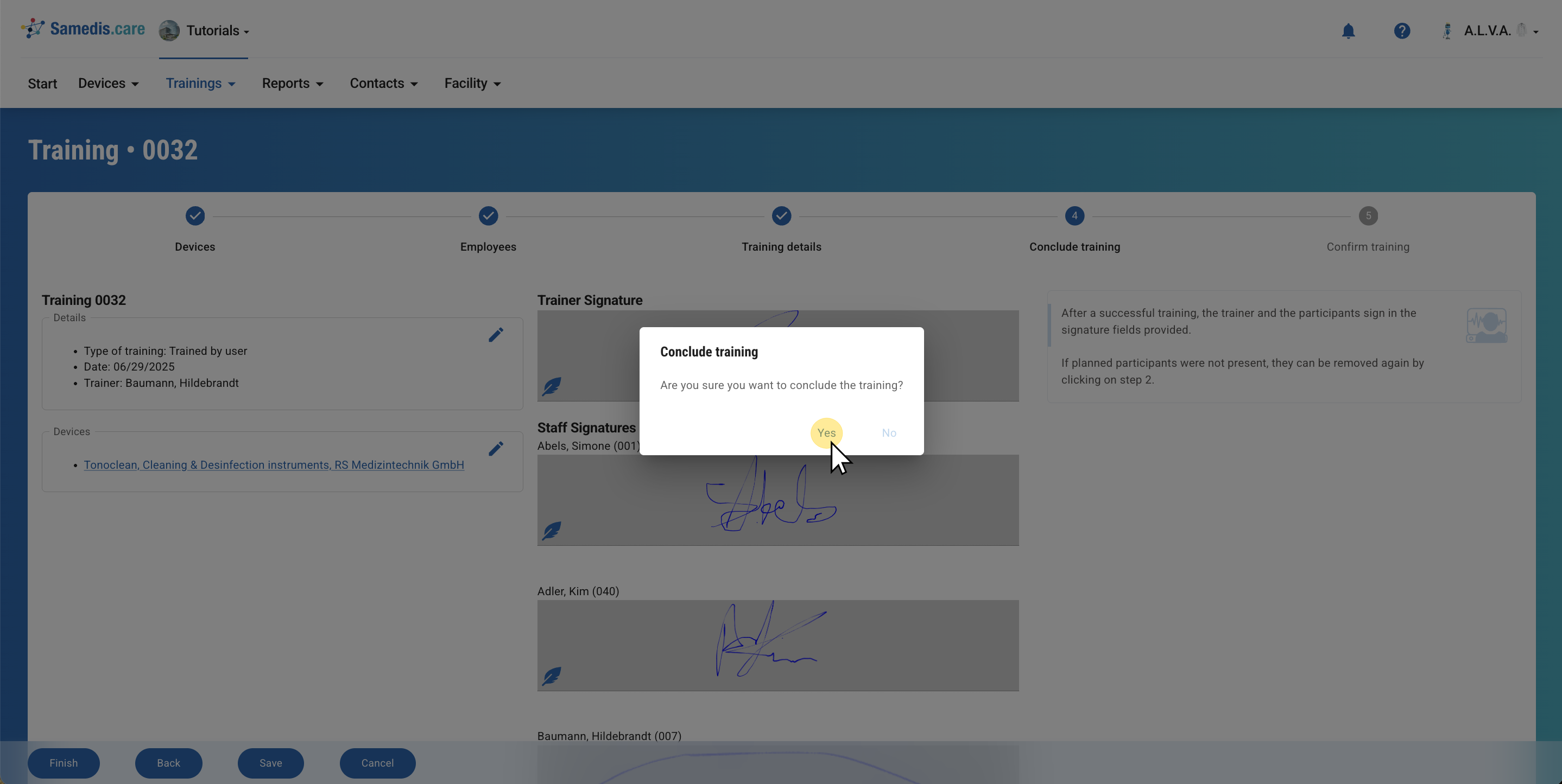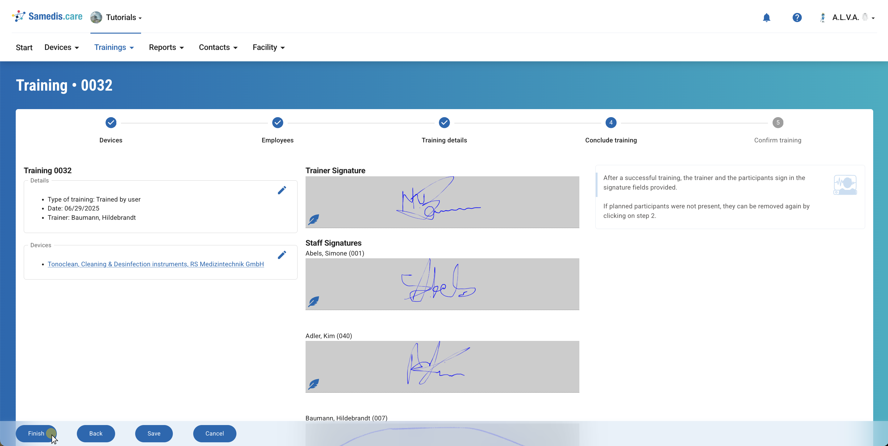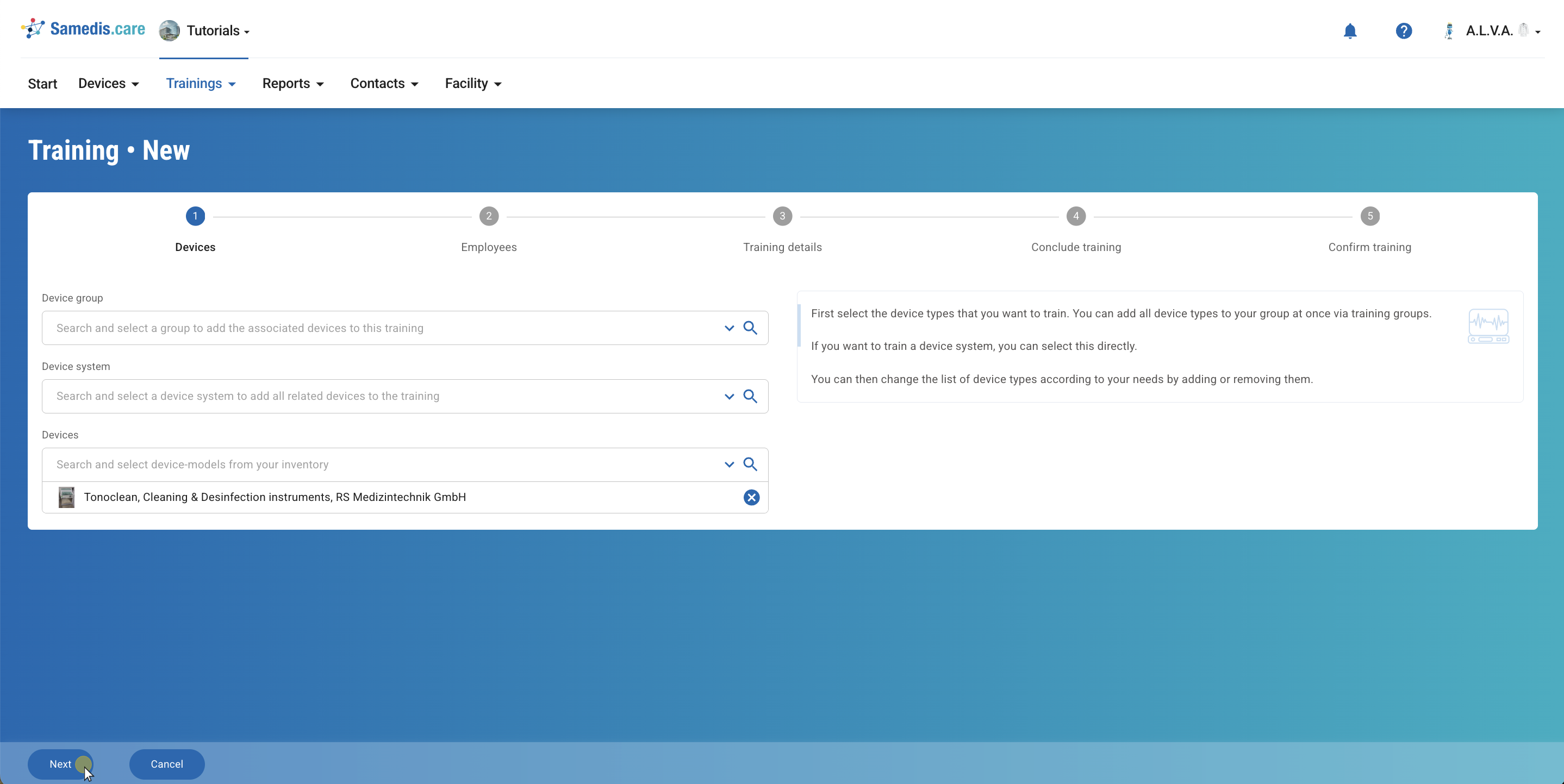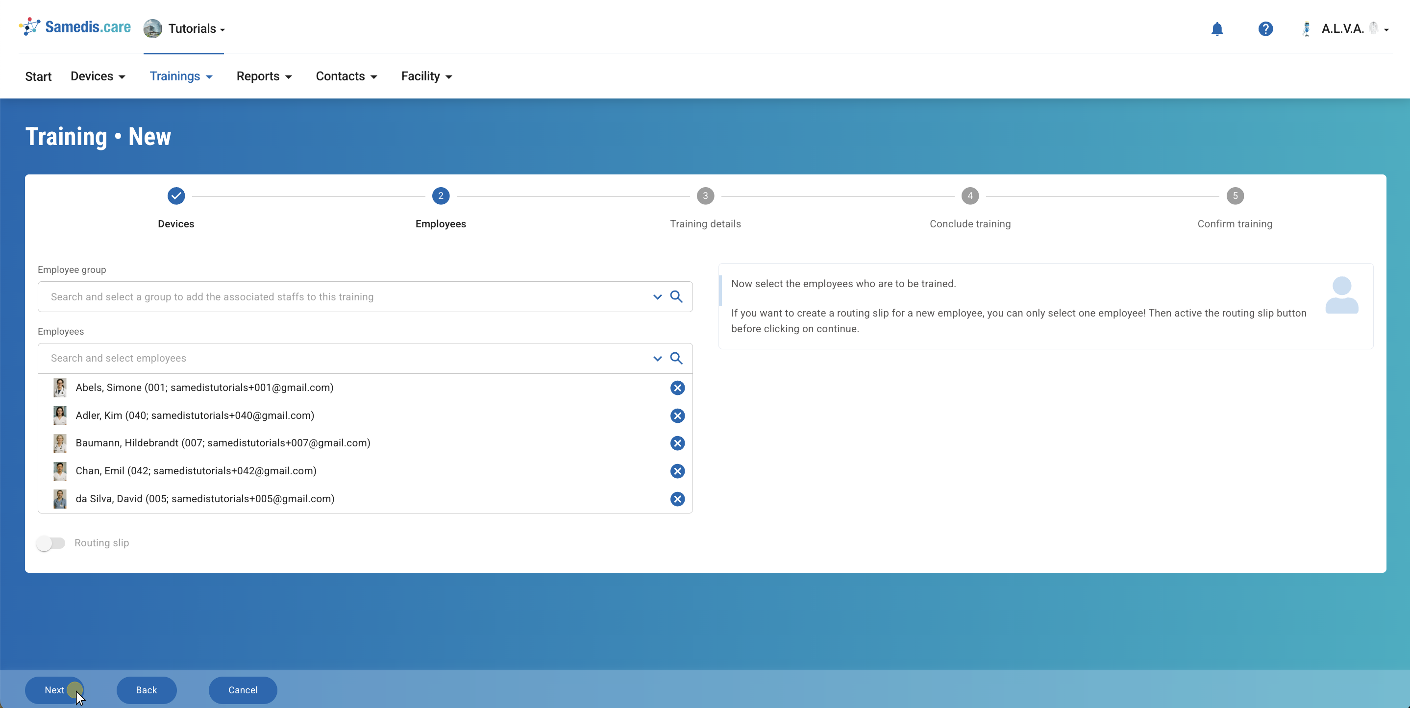 Enter all training details and review the previously selected devices and employees. If any of the details are incorrect, you can change them at any time by clicking Back or the ✏️-icon.
