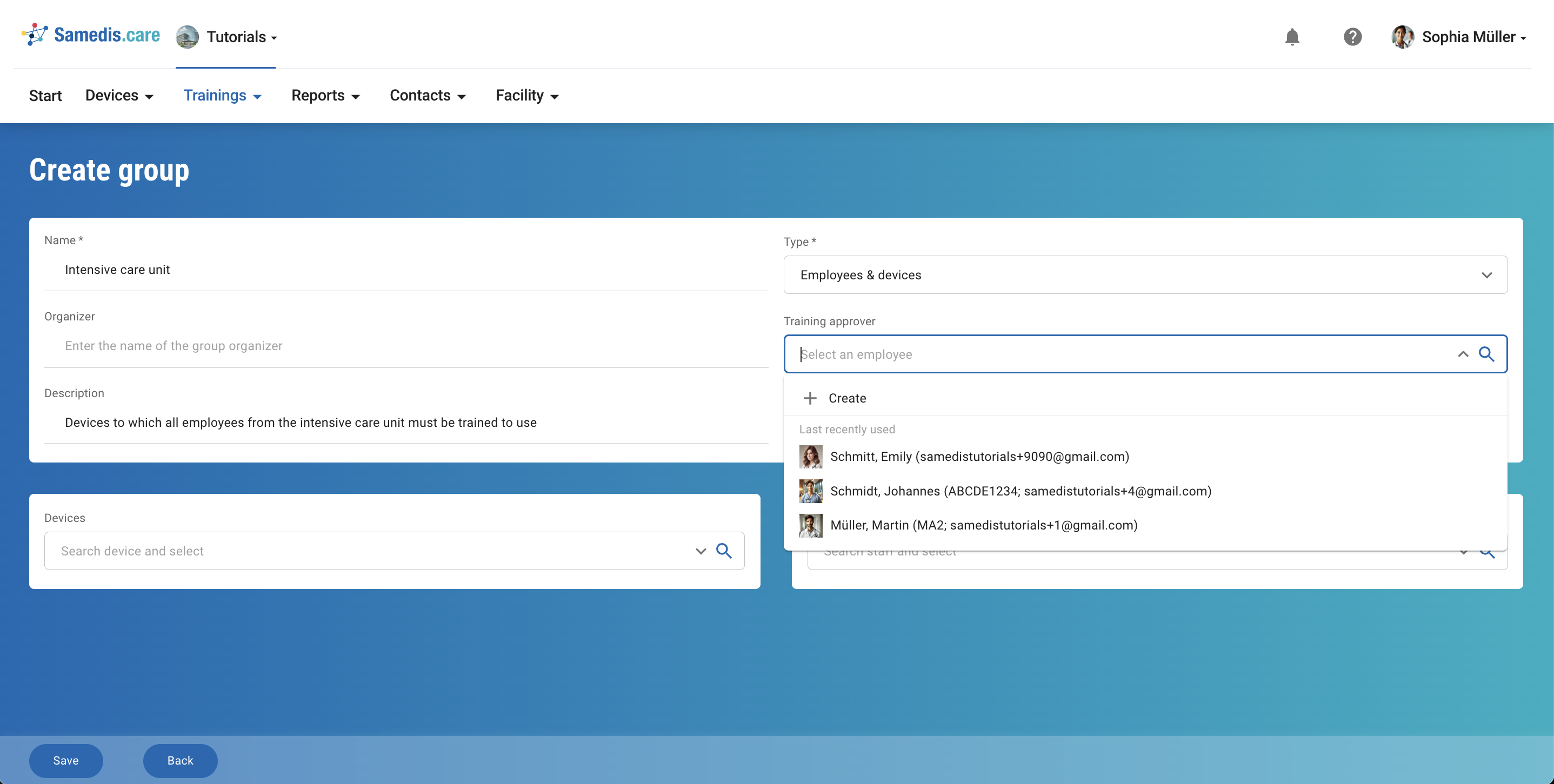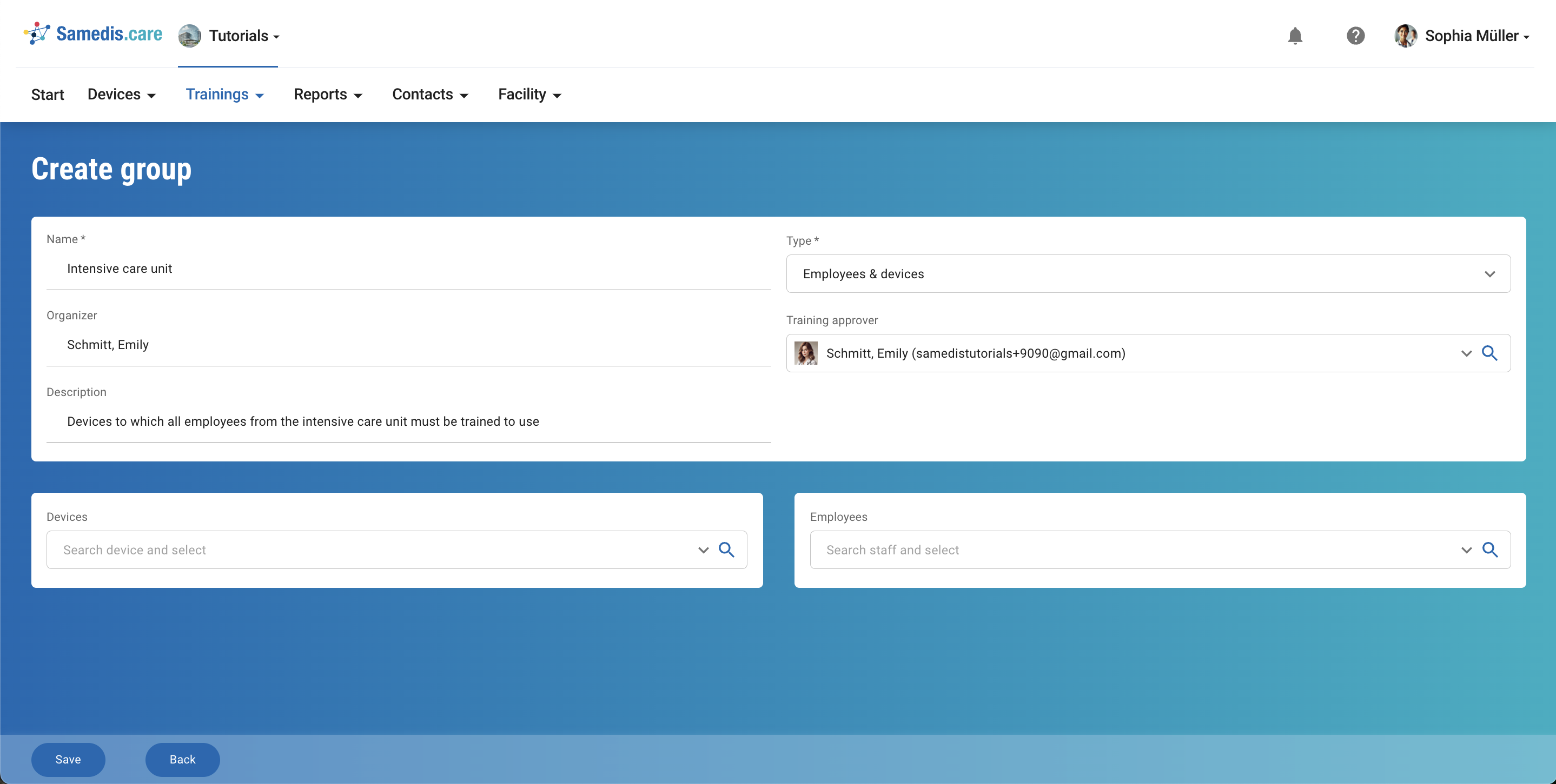 Under Training approver, select the person from your facility who will review and approve the content of the training. If someone else is responsible for organizing the training, you can specify that person under Organizer.