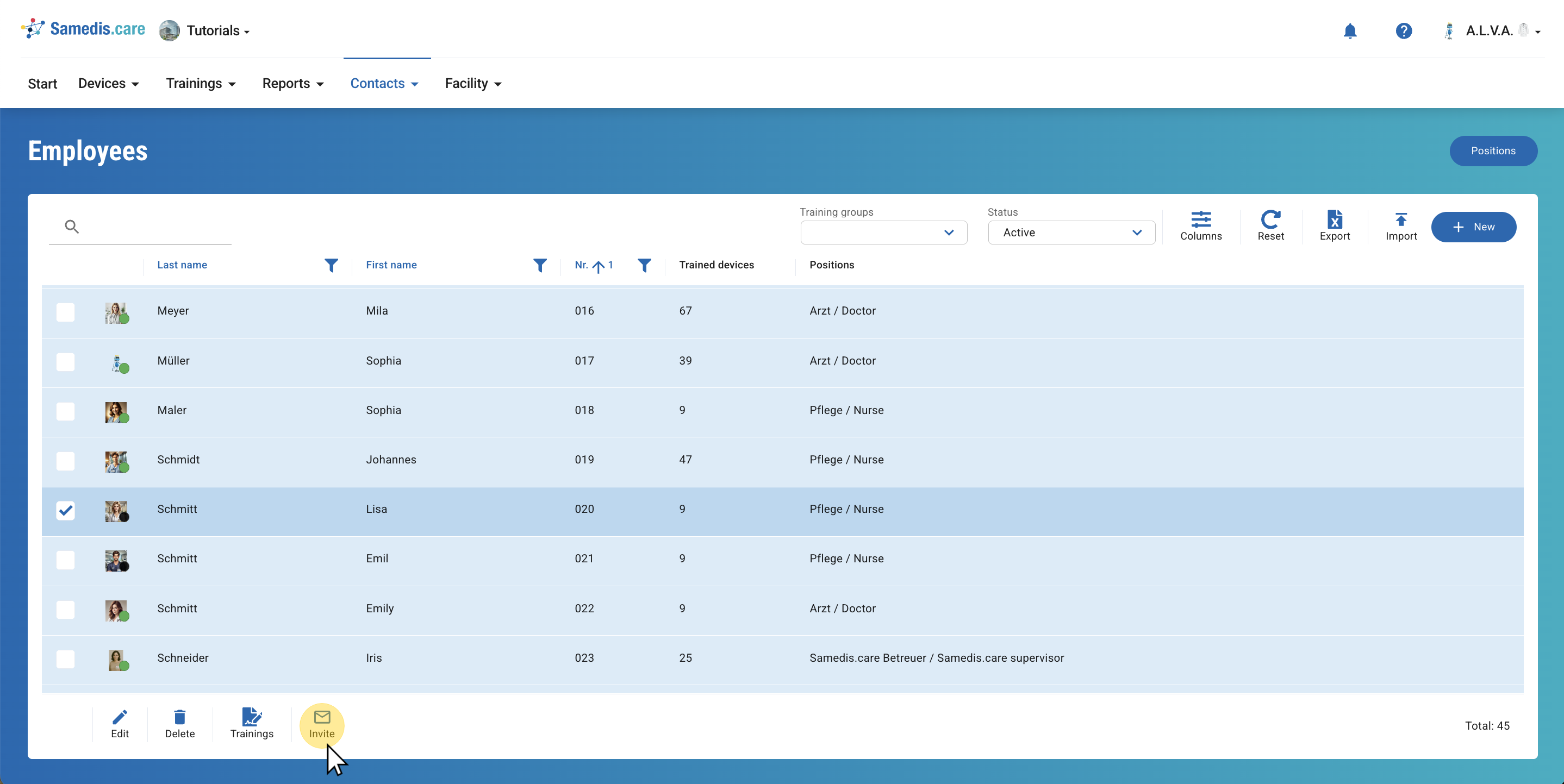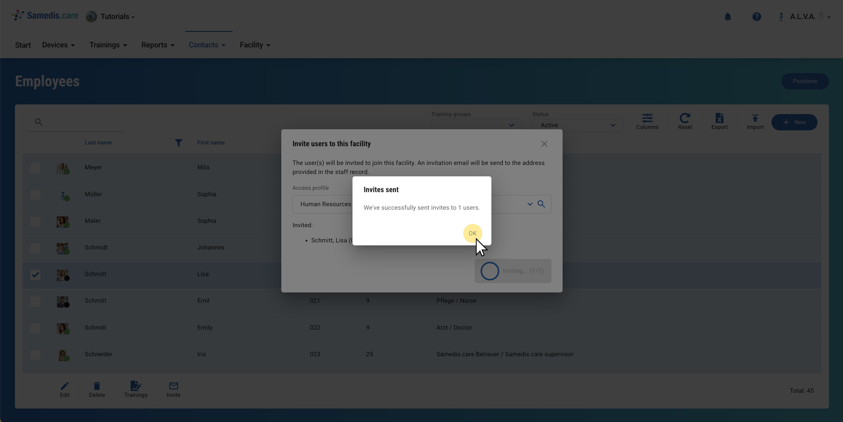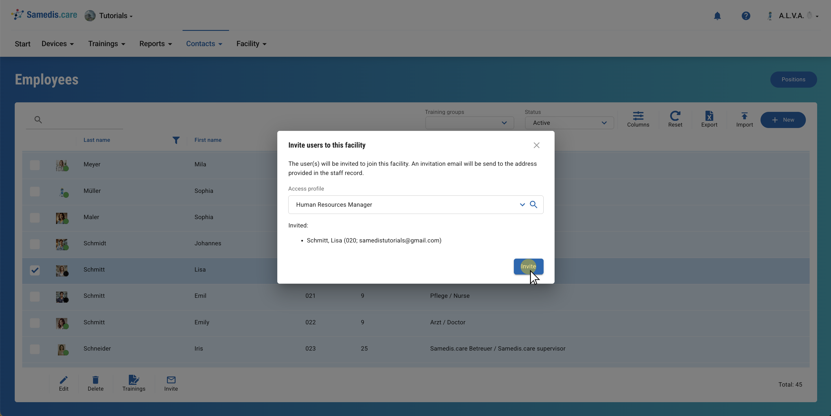 All persons who have access to your facility and can view the employee list are also authorized to invite other users. Invited persons automatically receive the Standard user profile and can then access their training data in my.samedis.care.