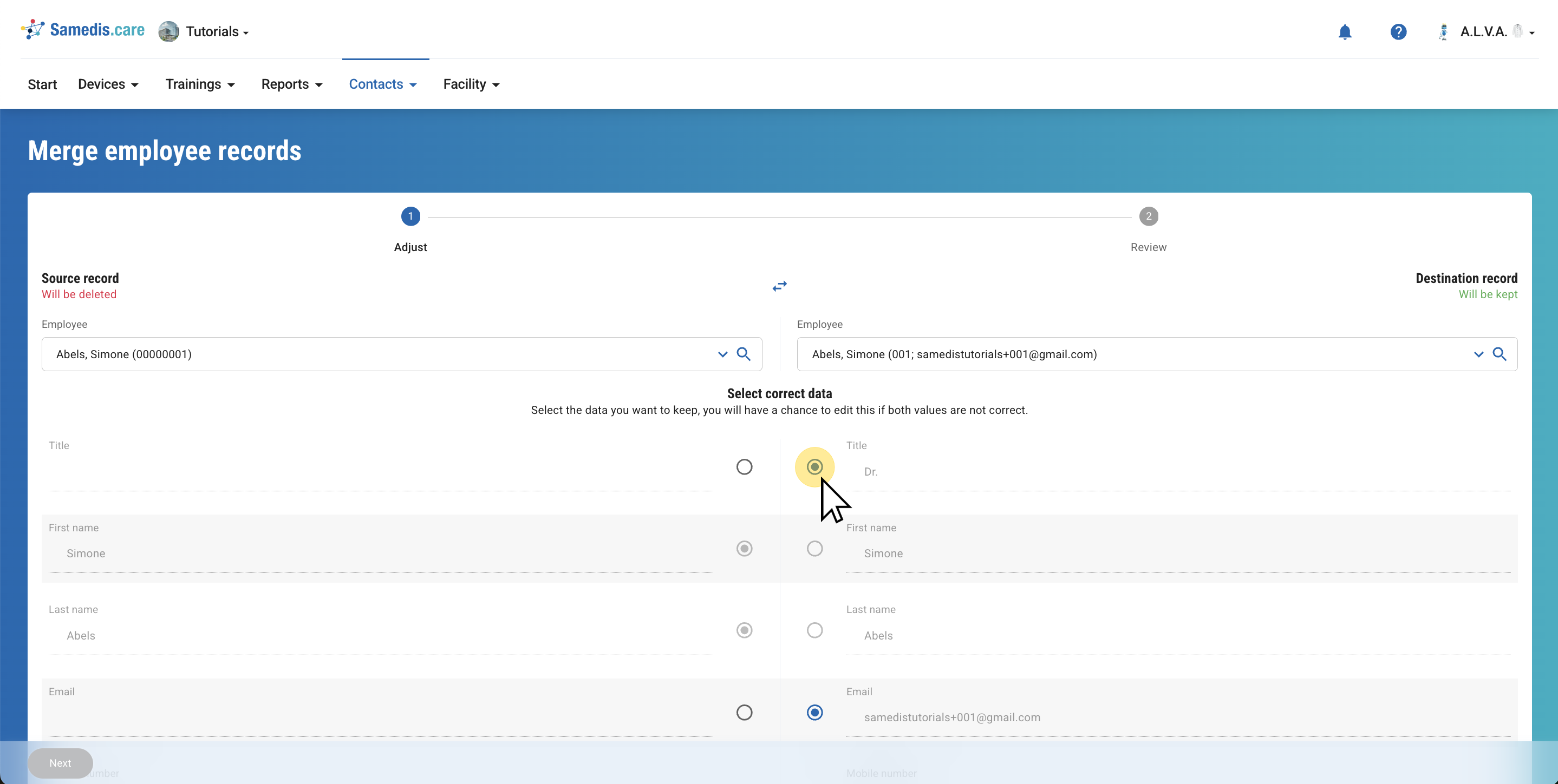 Now select the destination record – the employee entry that belongs to the same person and that you want to keep.