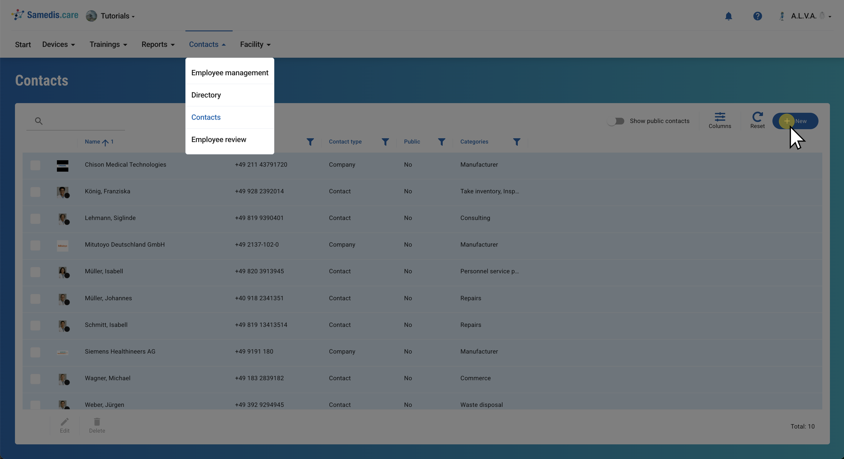Click on + New to create a new external contact for your facility in Samedis.care.