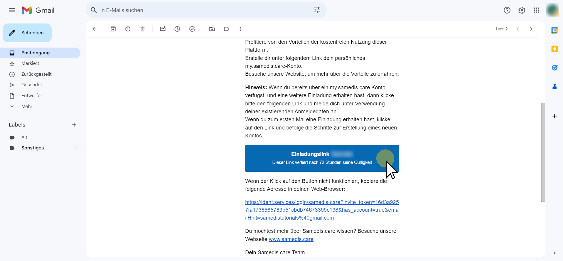 In der Einladungs-Mail ist aufgeführt, welche Rechte du innerhalb von Samedis.care hast. Lies dir die E-Mail daher zunächst aufmerksam durch.