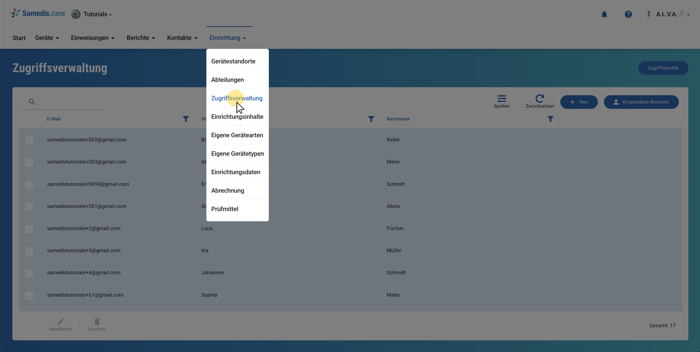 In Samedis.care kannst du sowohl interne als auch externe Personen (z. B. Gerätebeauftragte, Stationsleitungen, Mitarbeiter:innen, Service-Partner, etc.) zur Mitarbeit berechtigen. Über die Zugriffsverwaltung hast du die Möglichkeit, Mitarbeiter:innen oder Kontakte direkt einzuladen.