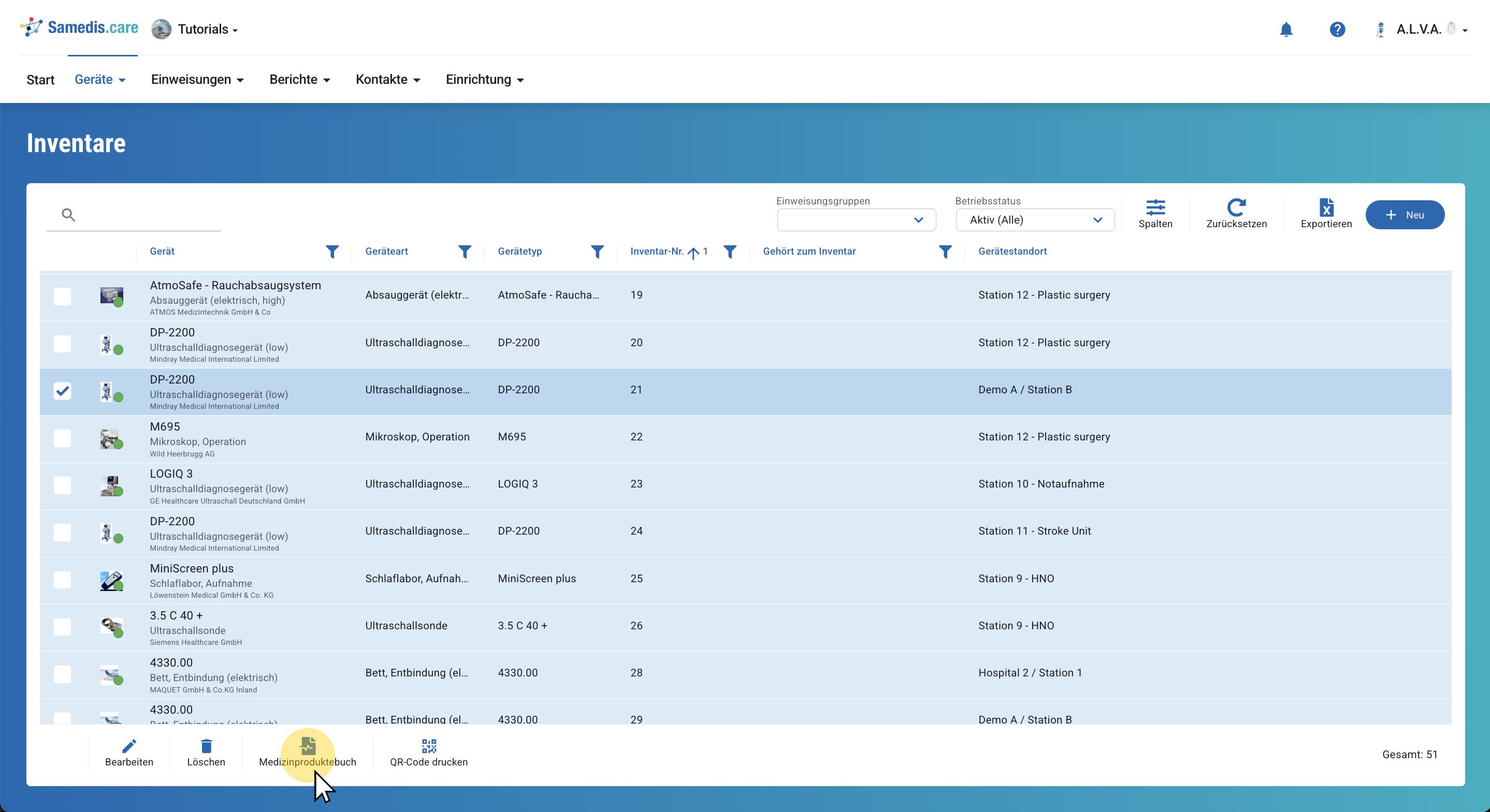 Rufe alternativ das gewünschte Gerät auf und klicke unter Mehrauf Medizinproduktebuch.