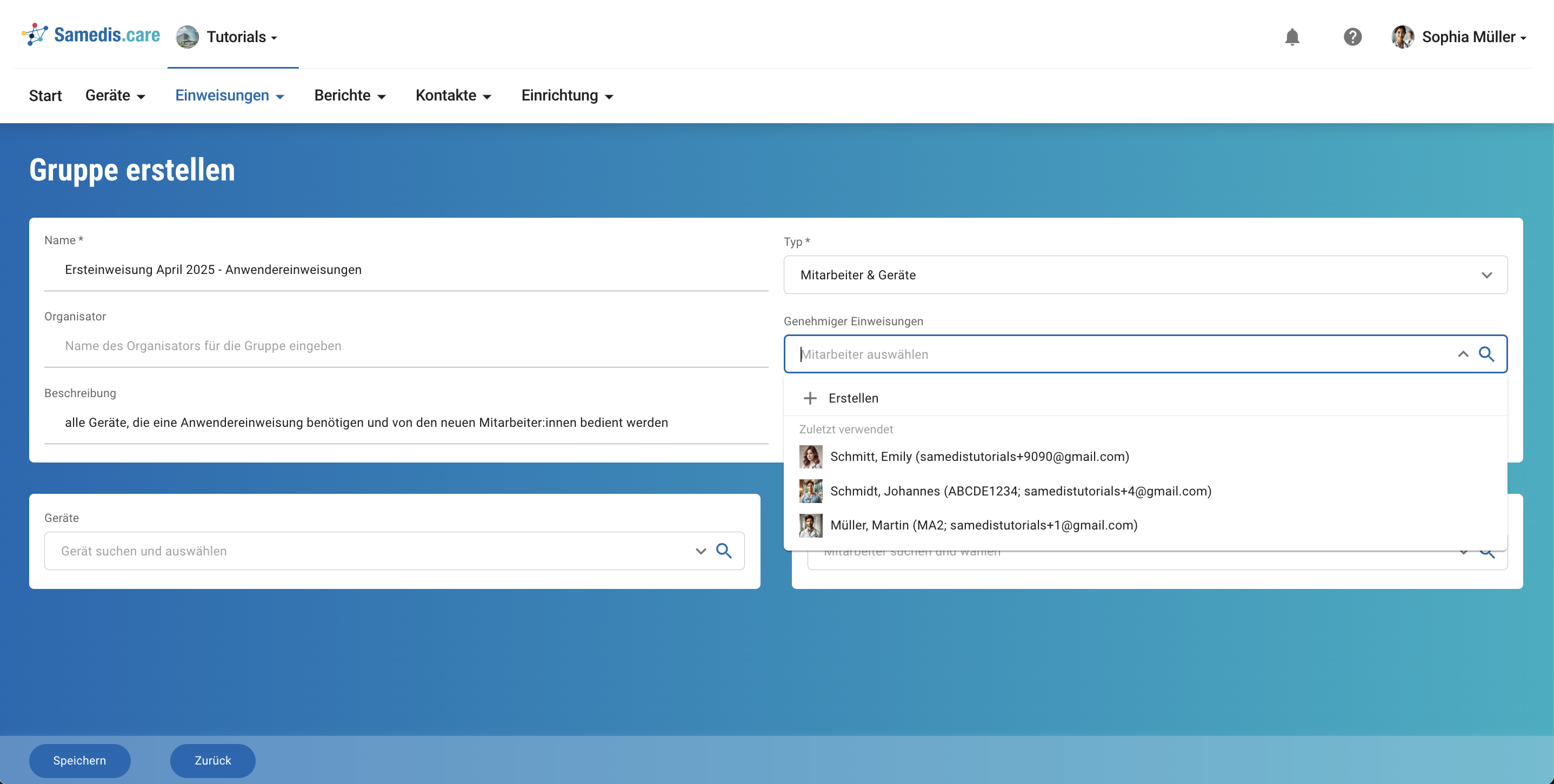 Unter Genehmiger Einweisungen kannst nur Personen auswählen, die Zugriff auf deine Einrichtung in Samedis.care haben.
