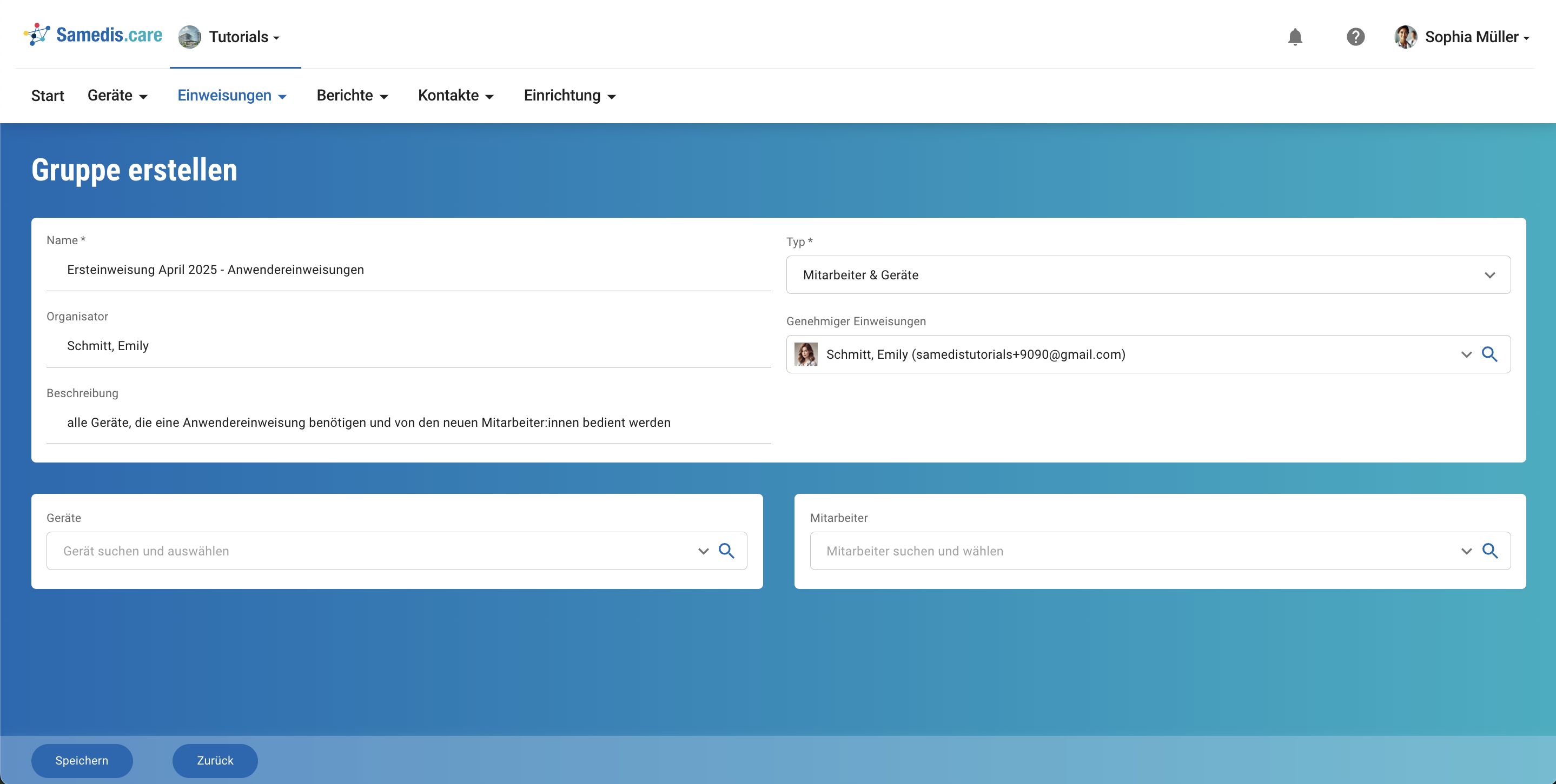 Füge nun die gewünschten Mitarbeiter:innen/Geräte zu deiner Gruppe hinzu und klicke anschließend auf Speichern.