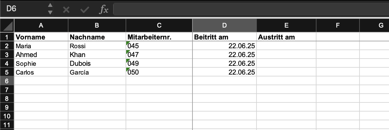 Lade dir die Importvorlage herunter und trage deine Mitarbeiterdaten ein.