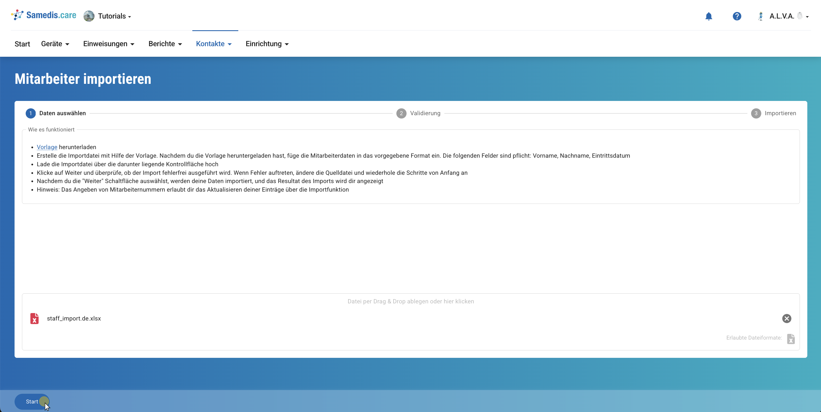 Verwende die Importfunktion, um viele Mitarbeitende auf einmal zu Samedis.care hinzuzufügen und bestehende Einträge bei Bedarf zu aktualisieren.