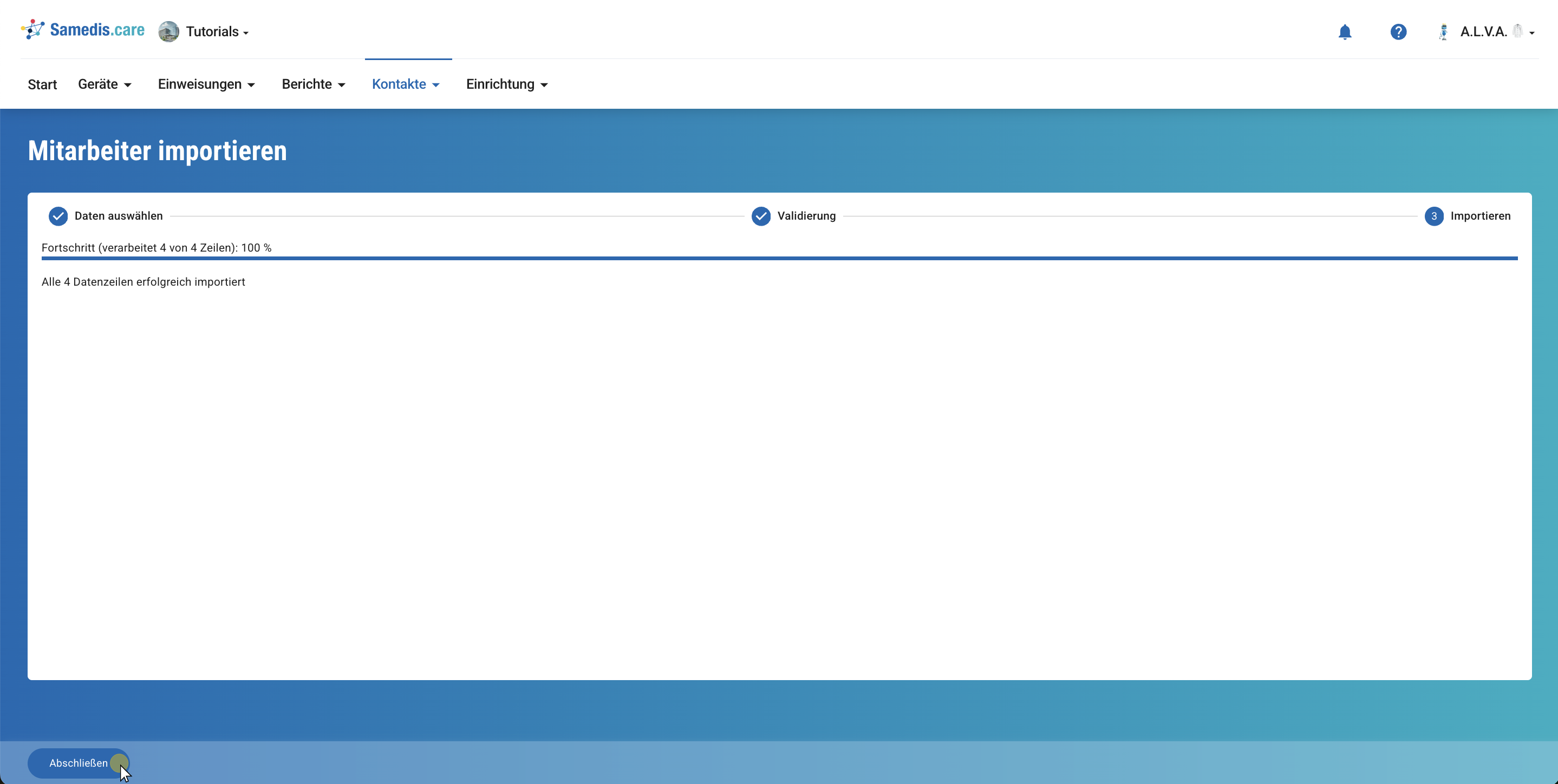 Samedis.care prüft jetzt deine Daten. Anschließend erhältst du eine Übersicht über den aktuellen Importstatus und mögliche Fehlermeldungen.
