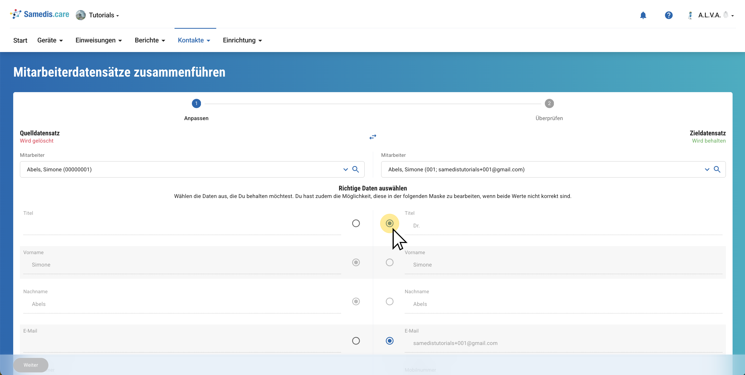 Sobald du für jedes Feld entschieden hast, welche Daten du übernehmen willst, klicke auf Weiter.