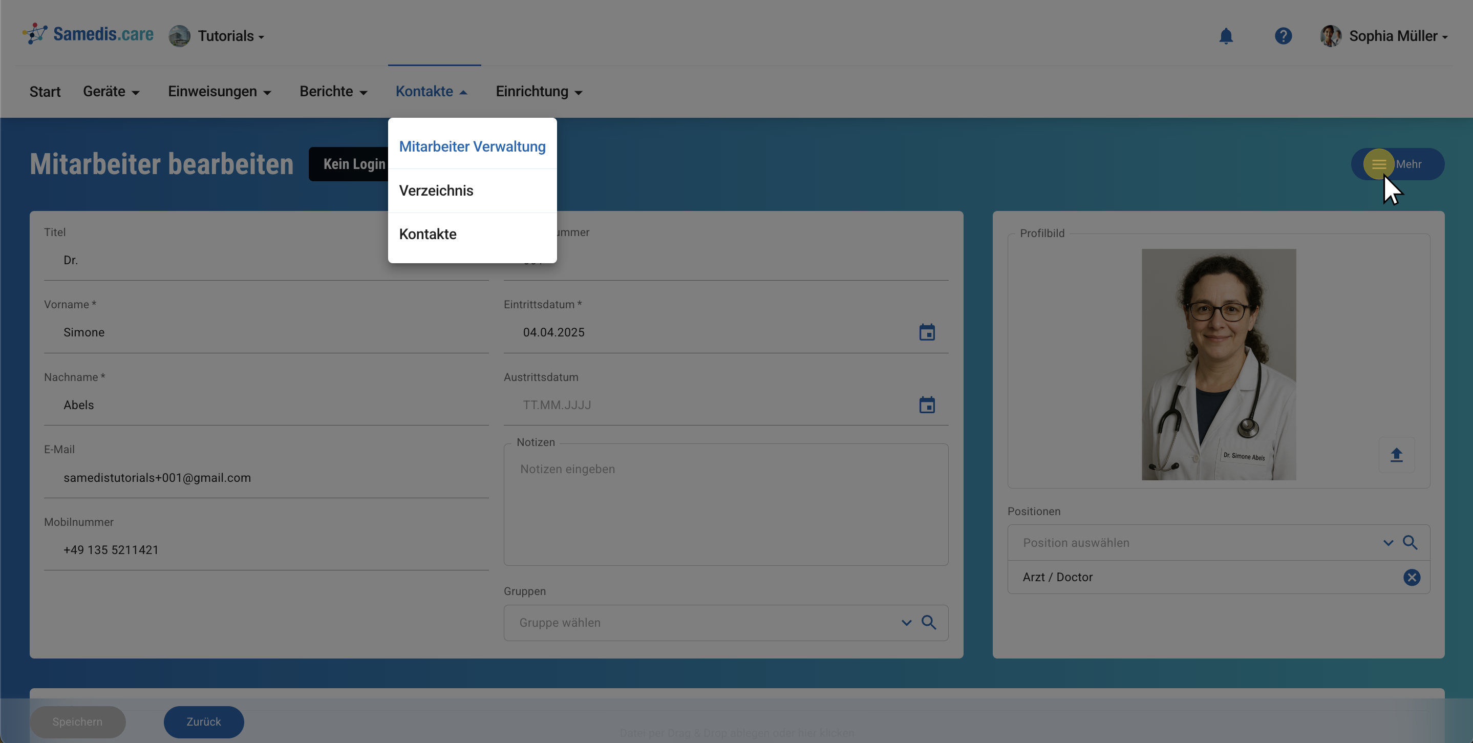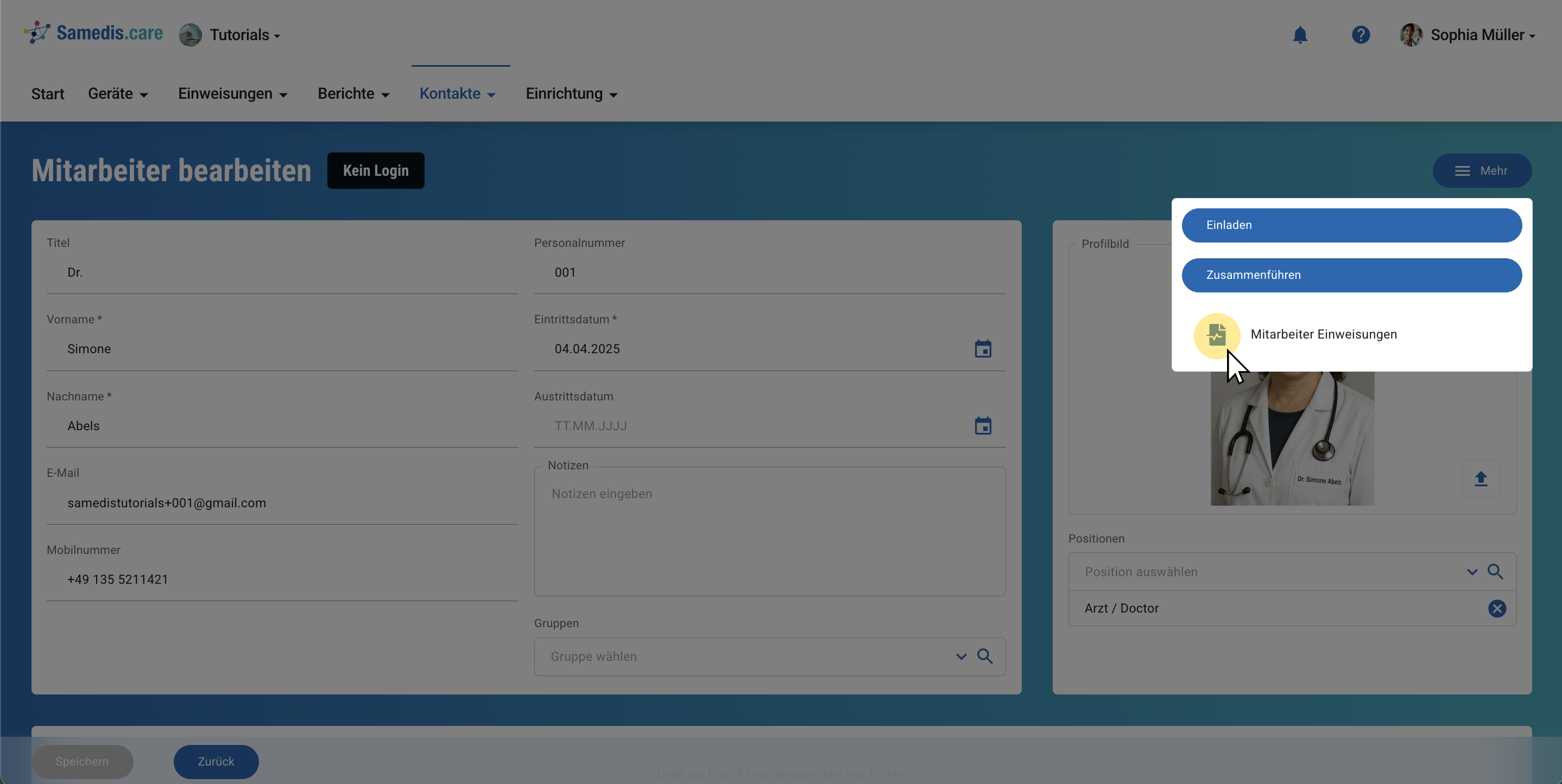 Wähle in der Mitarbeiter Verwaltung die Person aus, deren Einweisungsnachweise du einsehen möchtest. Klicke anschließend auf Mehr.