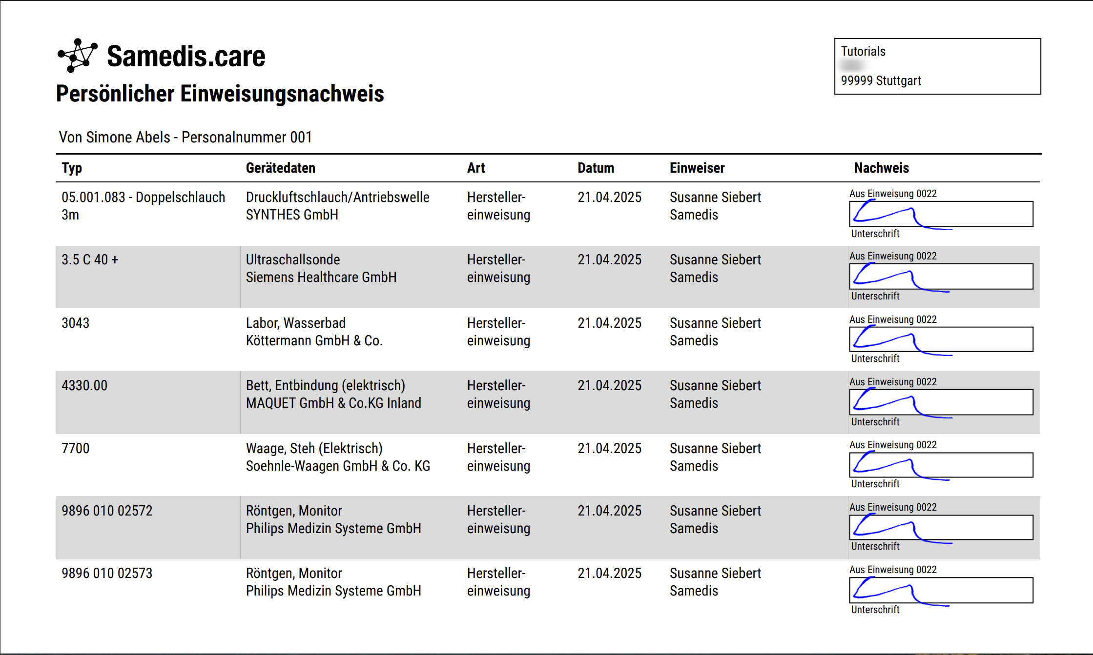 Mit Samedis.care kannst du für jede:n deiner Mitarbeiter:innen einen individuellen, digitalen Einweisungsnachweis erstellen. Die in Samedis.care dokumentierten Einweisungen werden dabei automatisch mit den Mitarbeiterdaten abgeglichen und entsprechend hinterlegt.