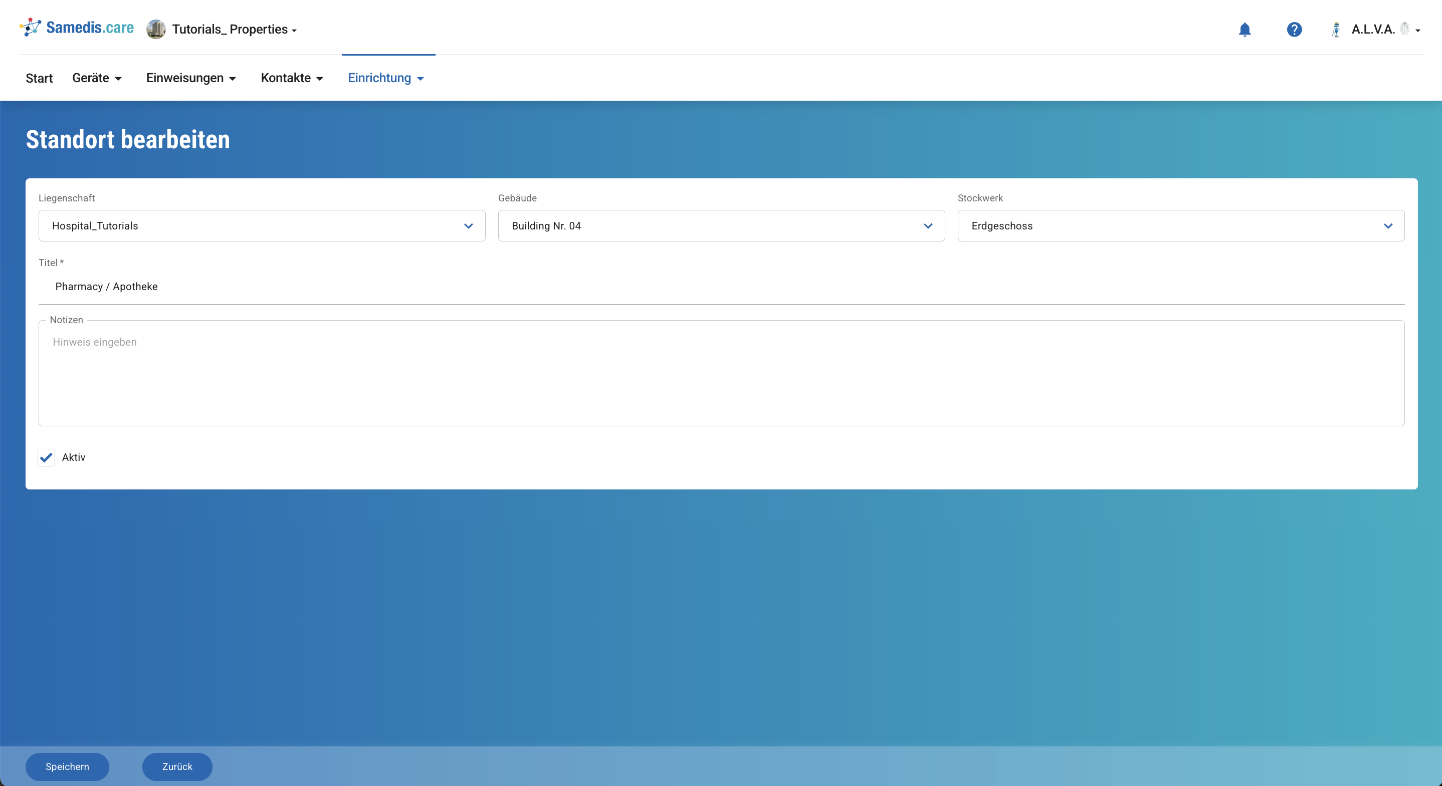 Nun kannst du den Titel oder die Notizen nach Bedarf anpassen. Falls ein Standort nicht mehr aktiv ist, aber noch Geräte zugeordnet sind, kannst du ihn auf inaktiv setzen.