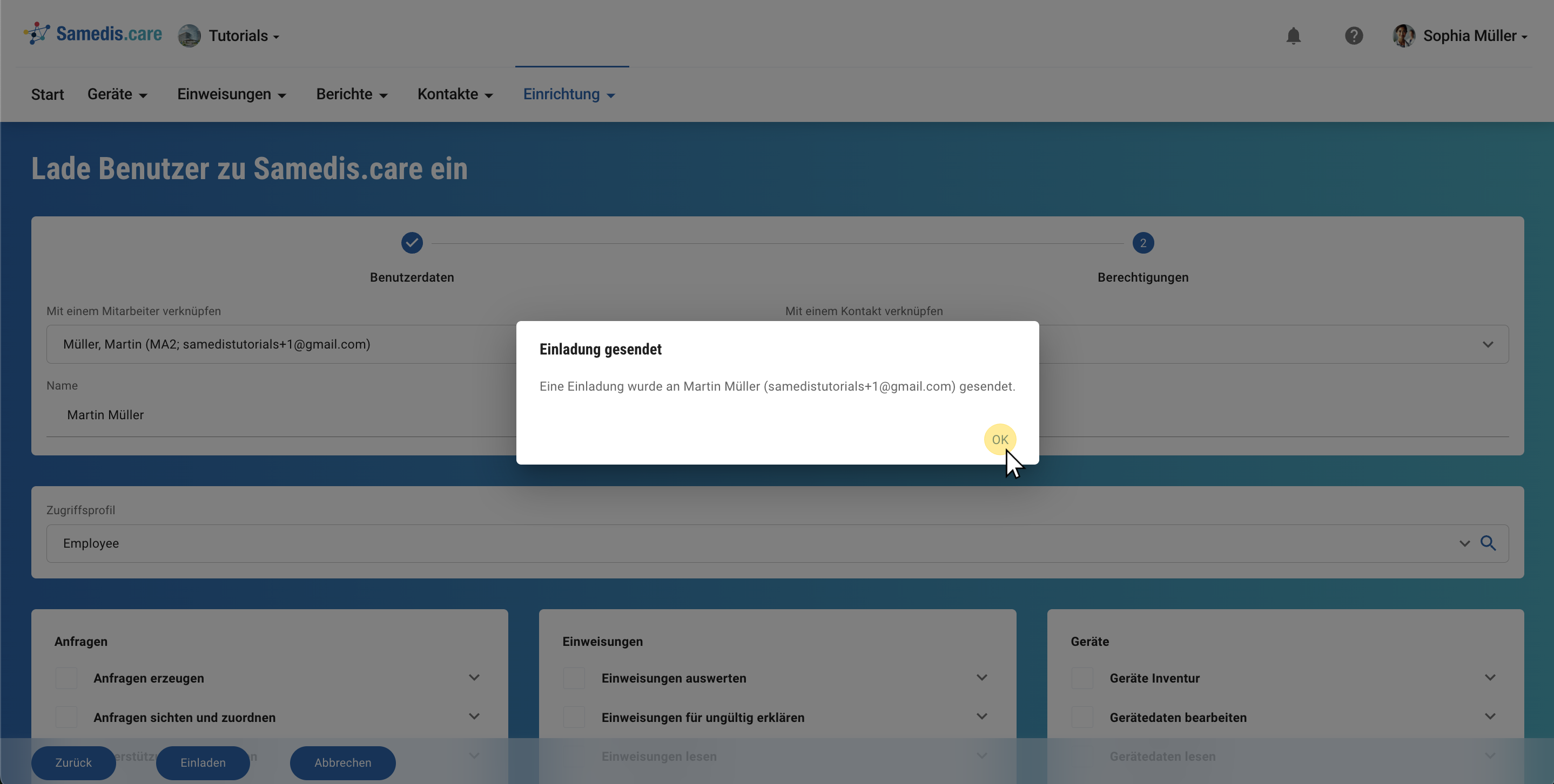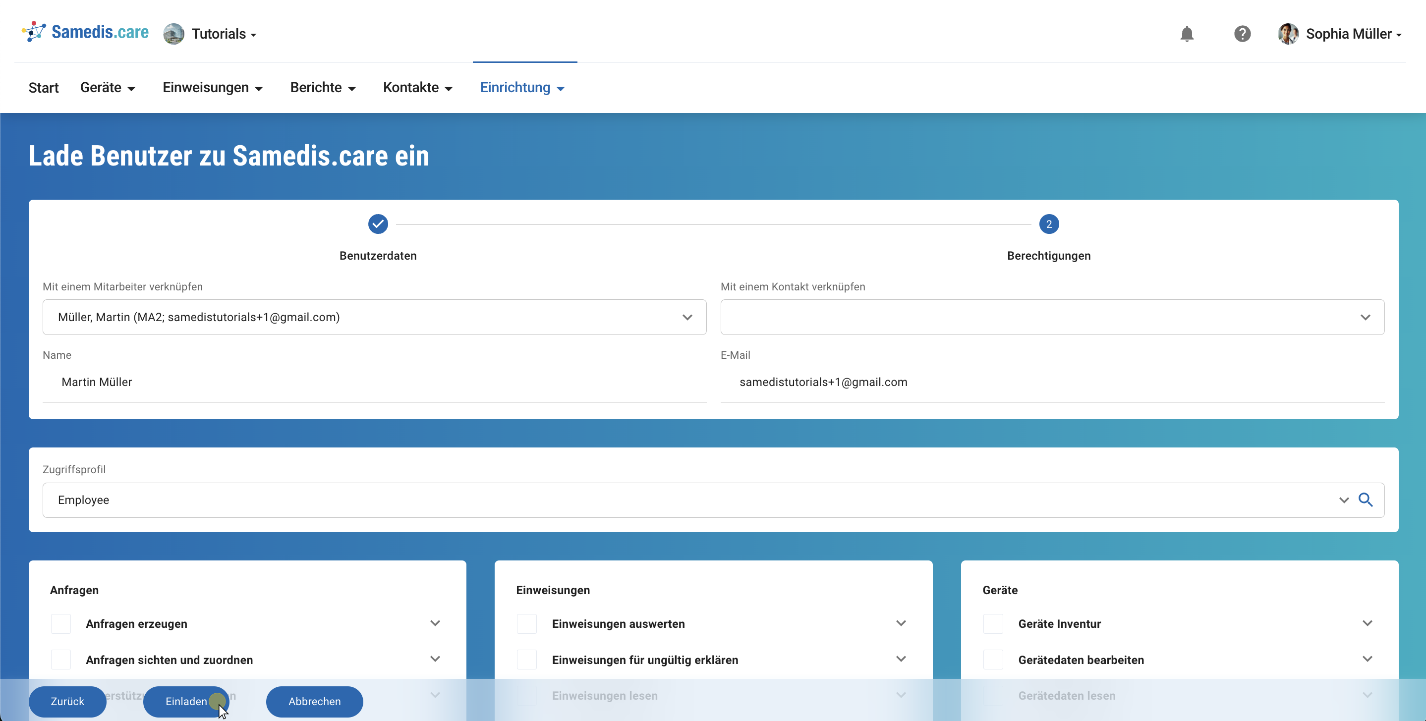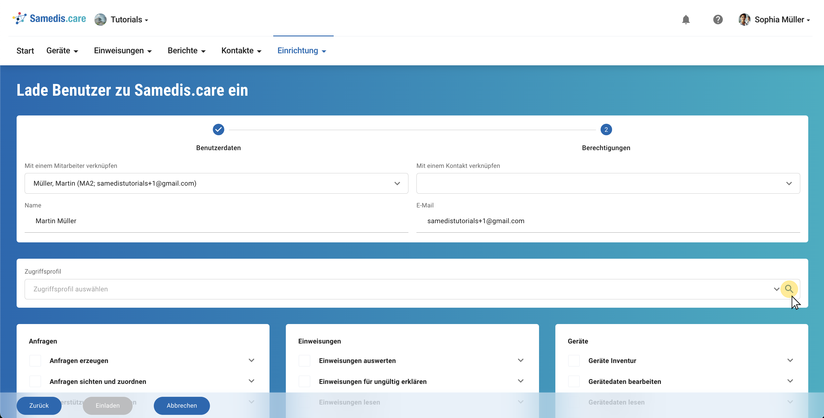 Wähle ein Zugriffsprofil aus, das du für deine Samedis.care Einrichtung angelegt hast, oder lege individuell fest, welche Berechtigungen die Person erhalten soll.
