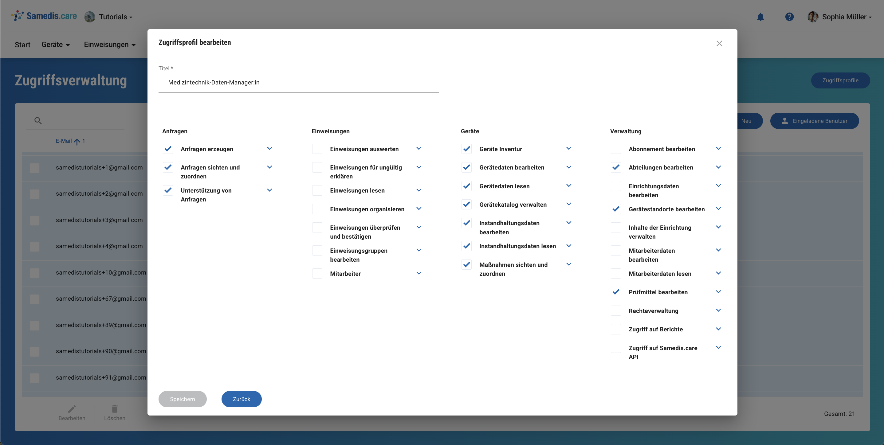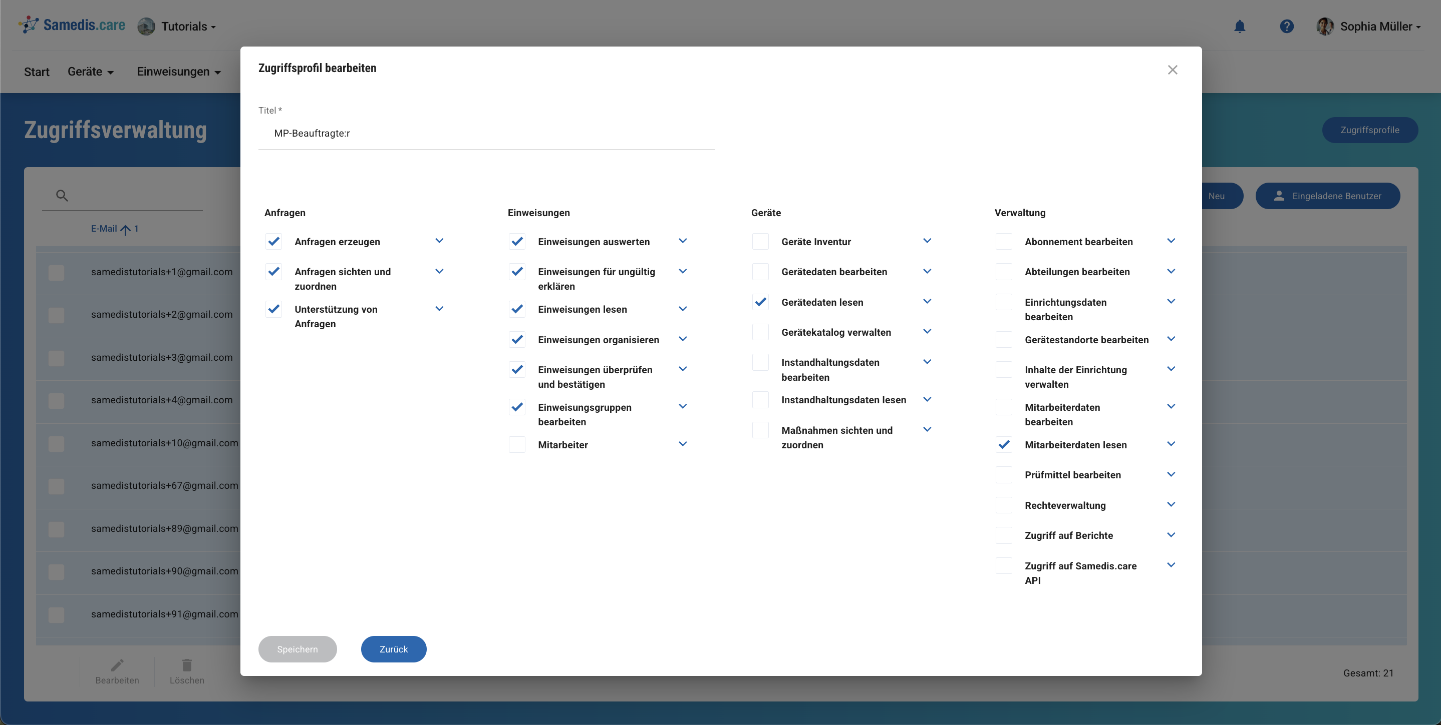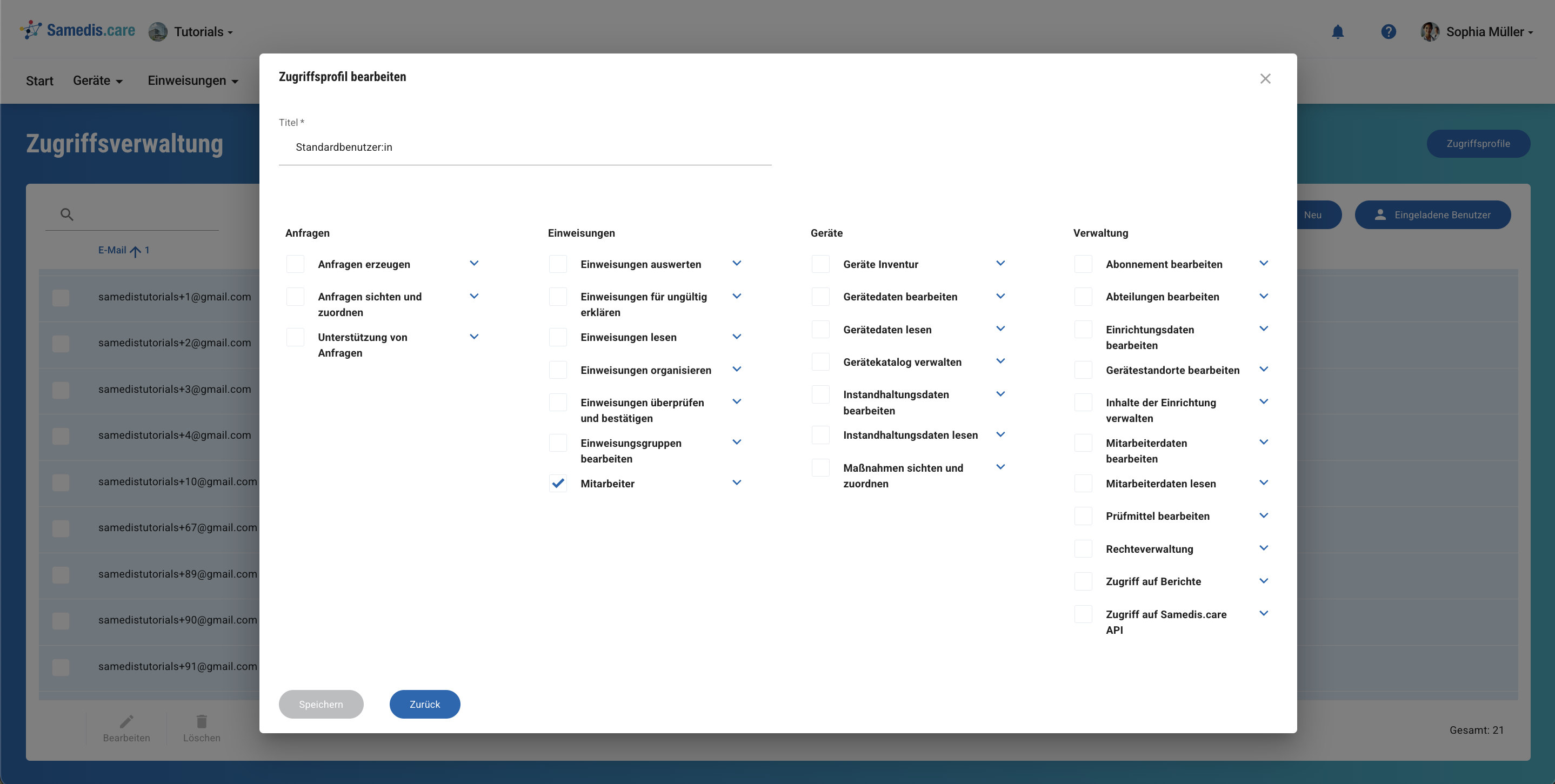 Standardbenutzer:innen nutzen medizintechnische Geräte im Arbeitsalltag. Daher sollten sie die Möglichkeit haben, ihre Einweisungen im Portal my.samedis.care einzusehen (Benutzerrecht: Mitarbeiter).