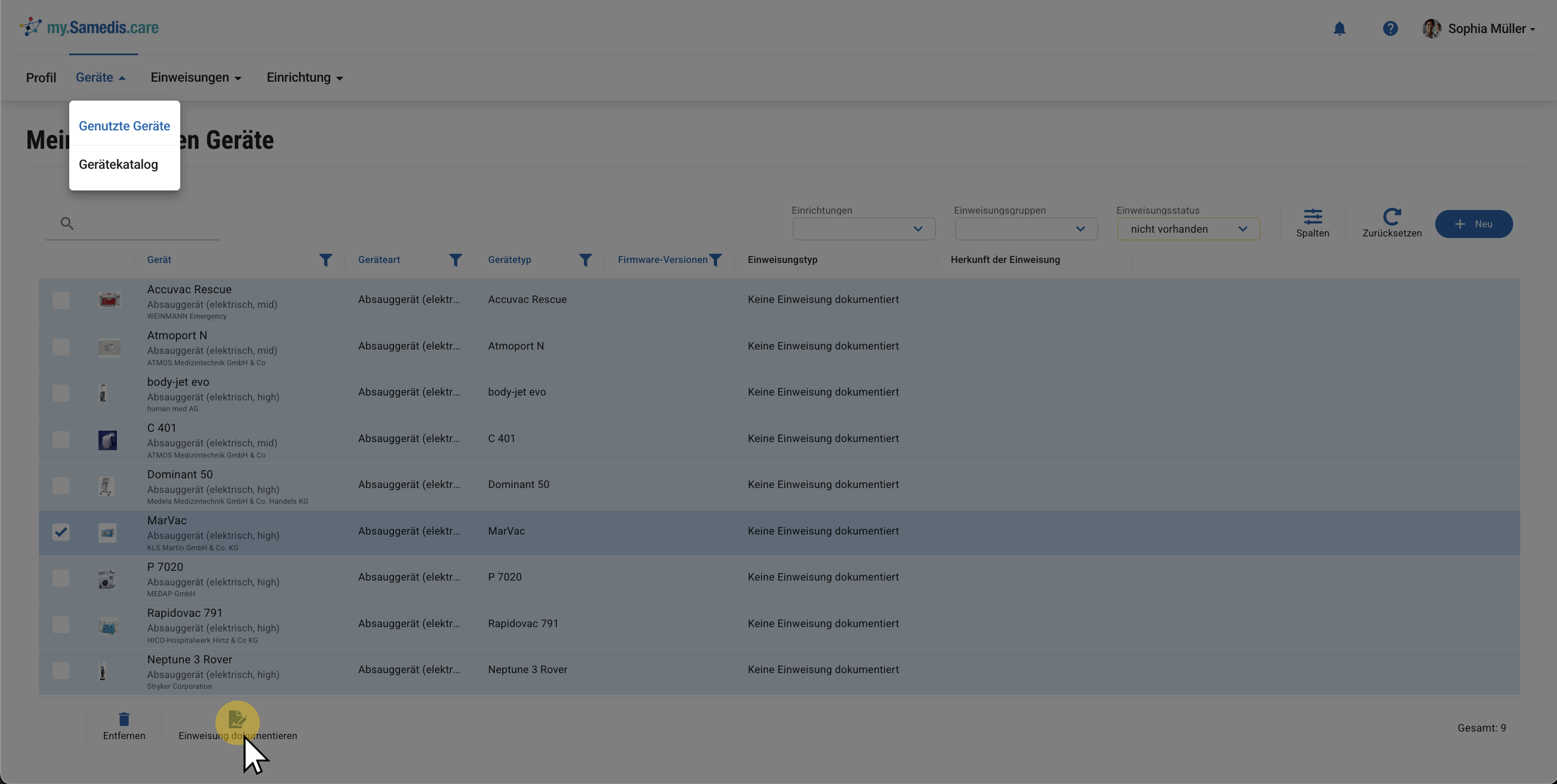 Du kannst Einweisungen auch selbst dokumentieren, indem du unter Genutzte Geräte das entsprechende Gerät auswählst und die Funktion Einweisung dokumentieren verwendest.