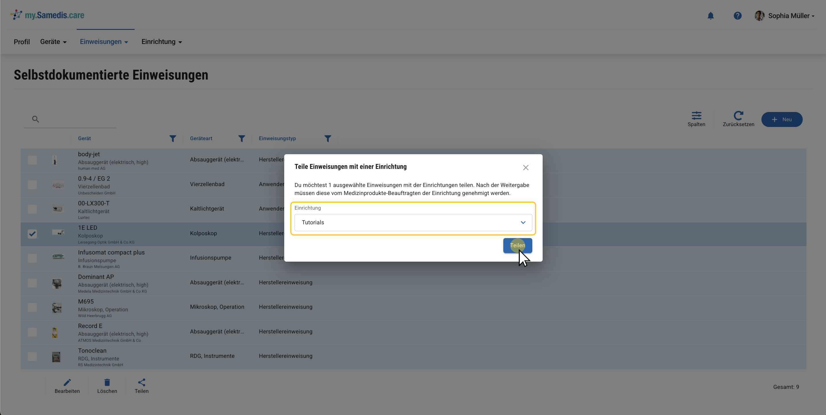 Die Option Teilen steht dir auch im Bereich Einweisungsnachweis zur Verfügung.