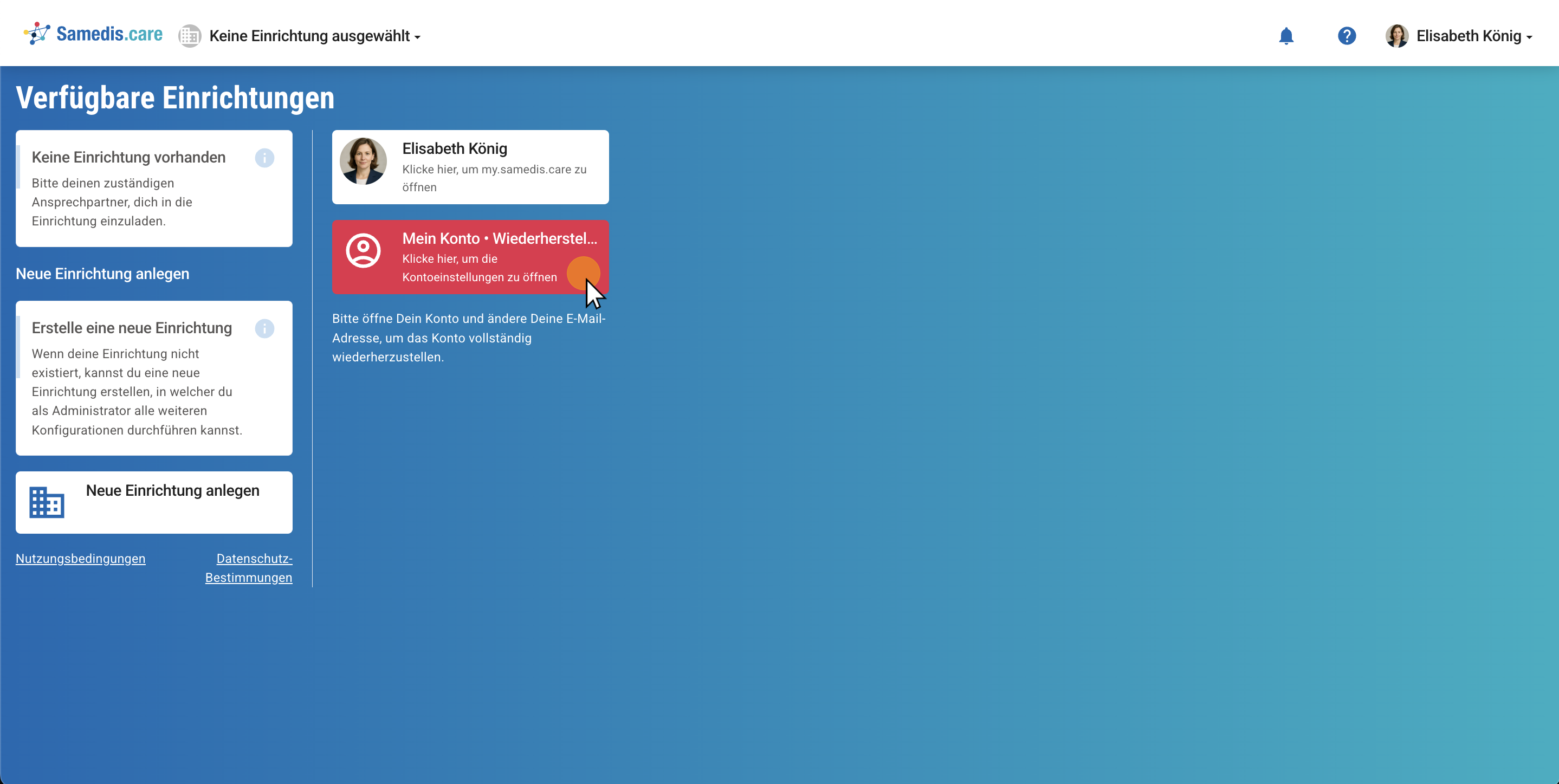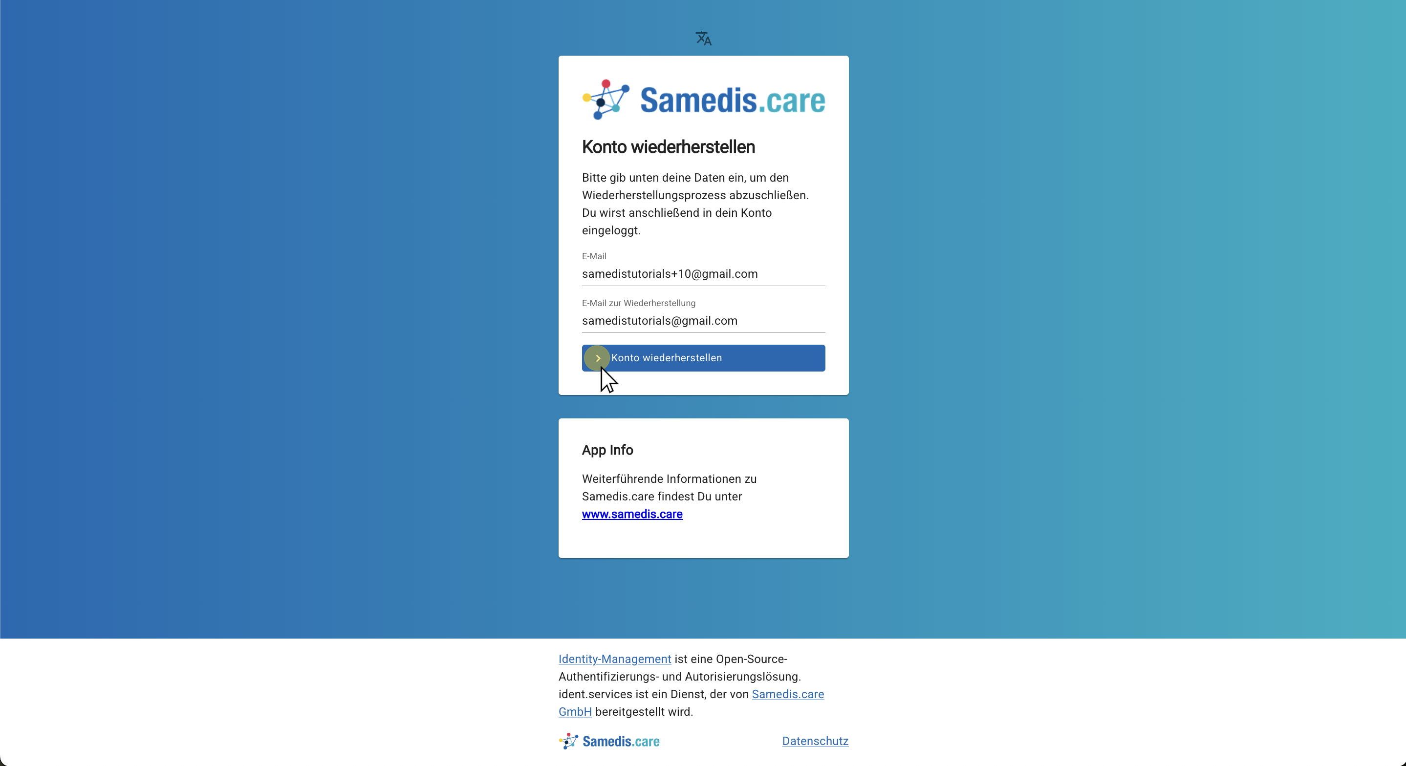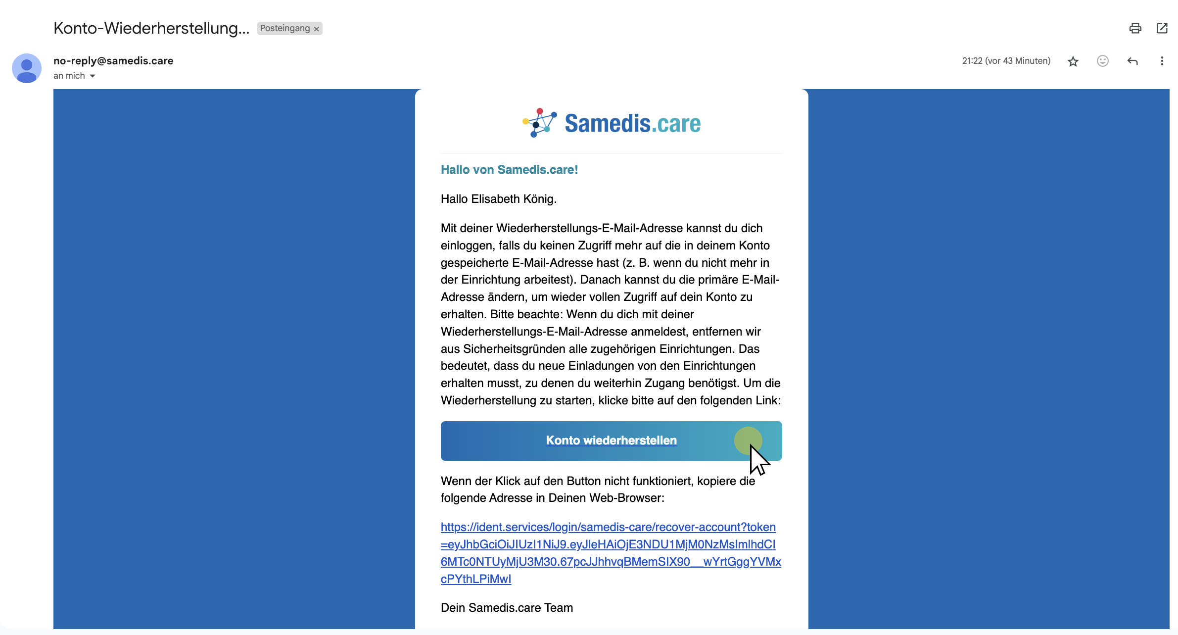 Öffne nun das Konto deiner Wiederherstellungs-E-Mail Adresse. Klicke anschließend in der E-Mail von Samedis.care auf den Link zur Wiederherstellung deines Kontos.
