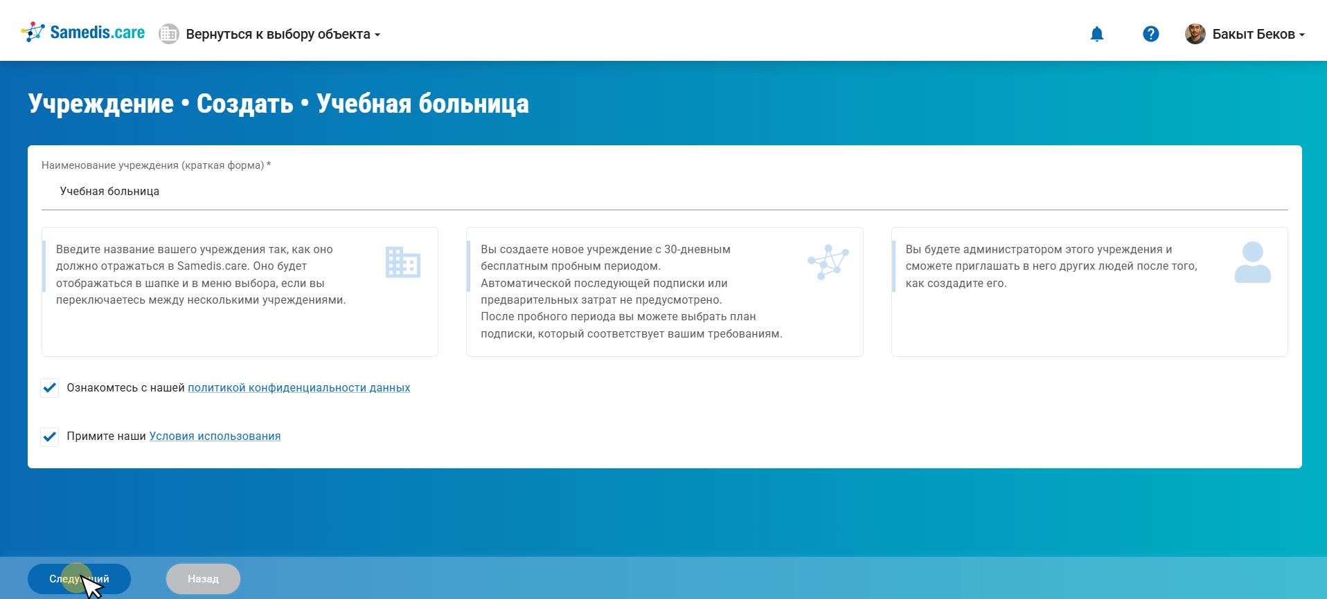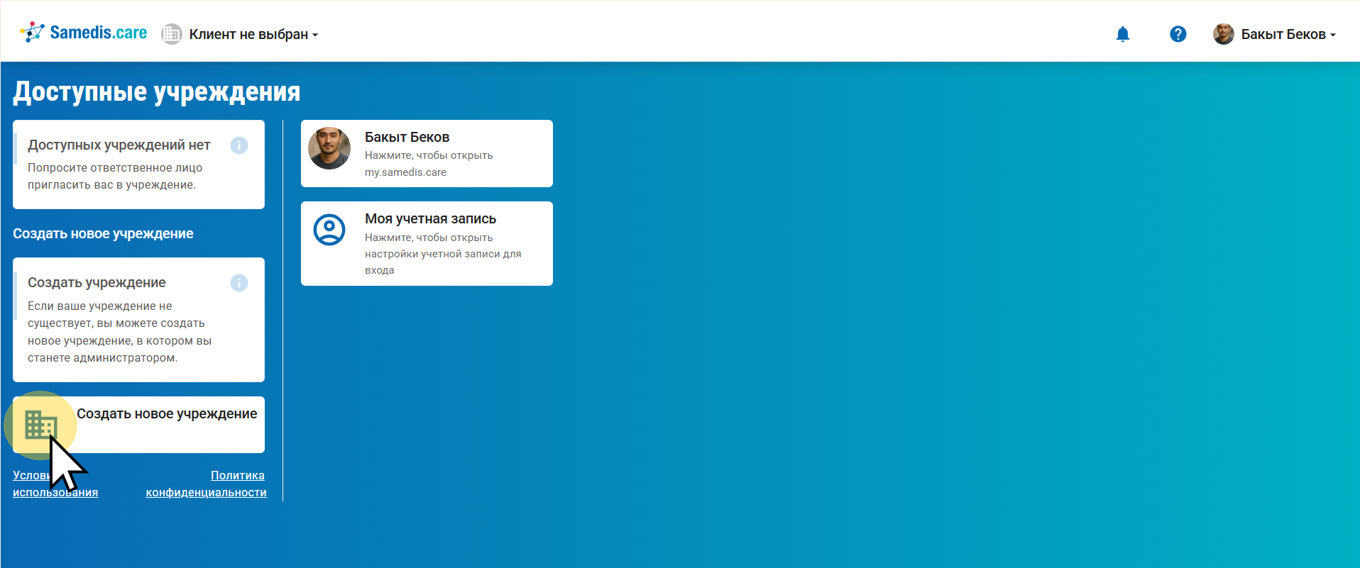 Если вы работаете в учреждении, которое уже использует Samedis.care, вам не нужно создавать новое.