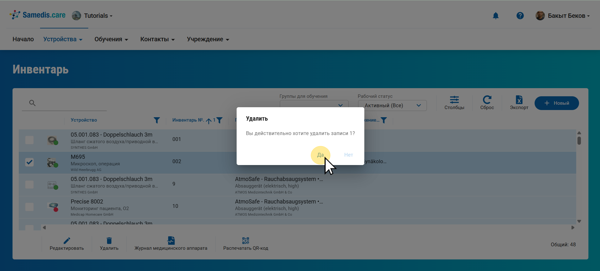 Если вы хотите удалить устройство или сотрудника, сначала необходимо удалить все связанные с ними мероприятия или обучения.