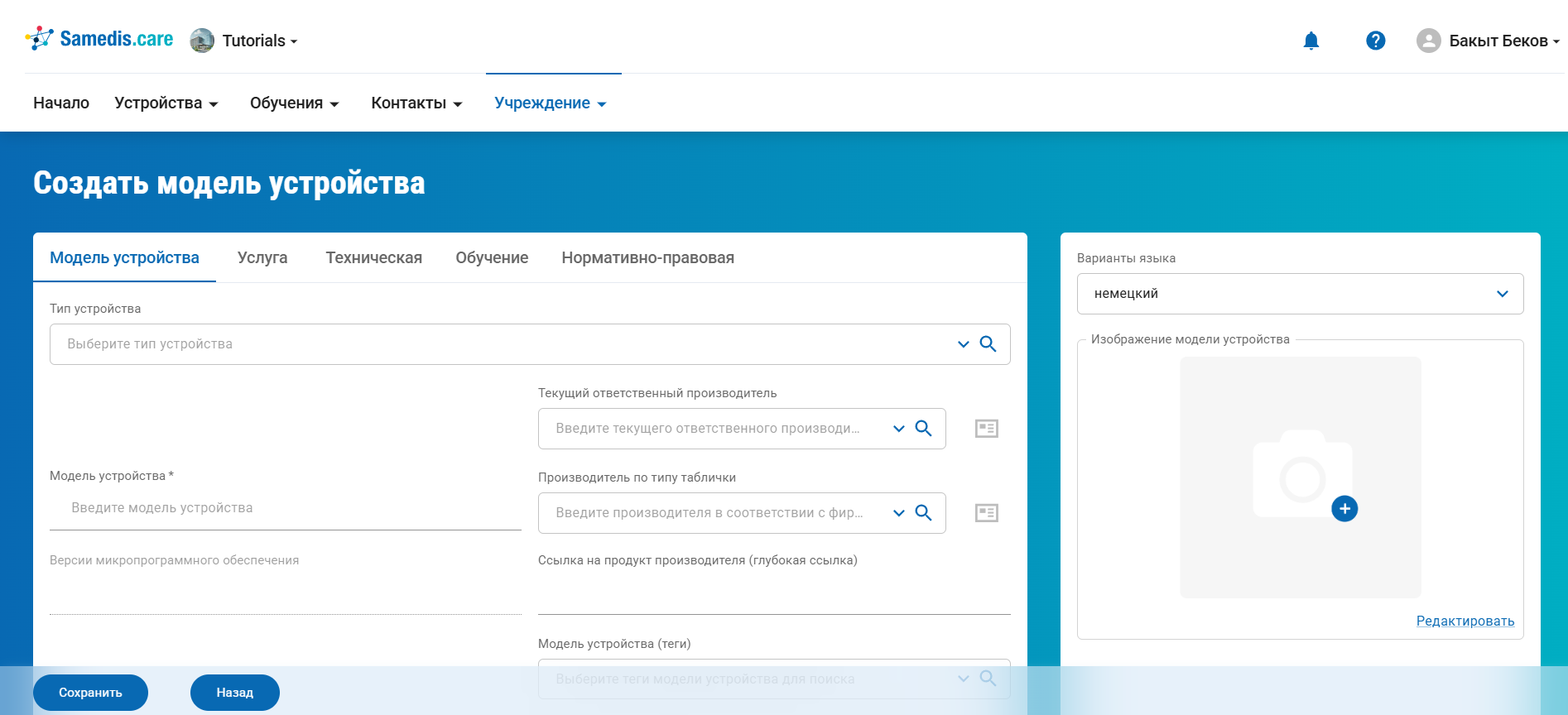 Чтобы создать новую модель устройства, перейдите в раздел Учреждение и выберите Собственные модели устройств. Там вы увидите все модели устройств, которые были созданы специально для вашего учреждения.