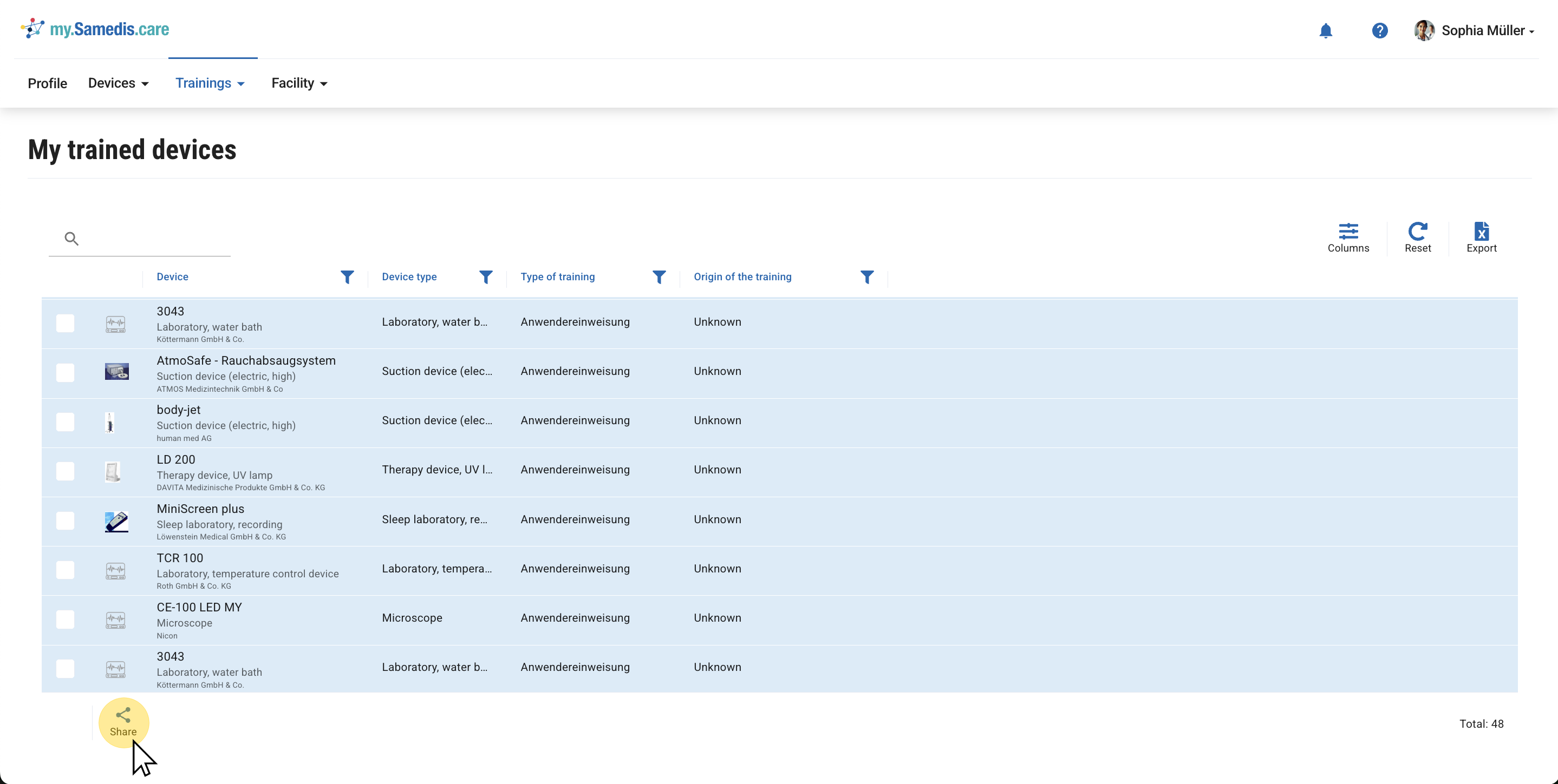 Вы можете выбрать отдельные обучения по устройствам, которыми хотите поделиться с новой организацией, или просто нажать Поделиться. Тогда автоматически будут переданы все релевантные обучения для устройств, которые также есть в вашей новой организации, и вы будете отмечены как обученный в их системе.