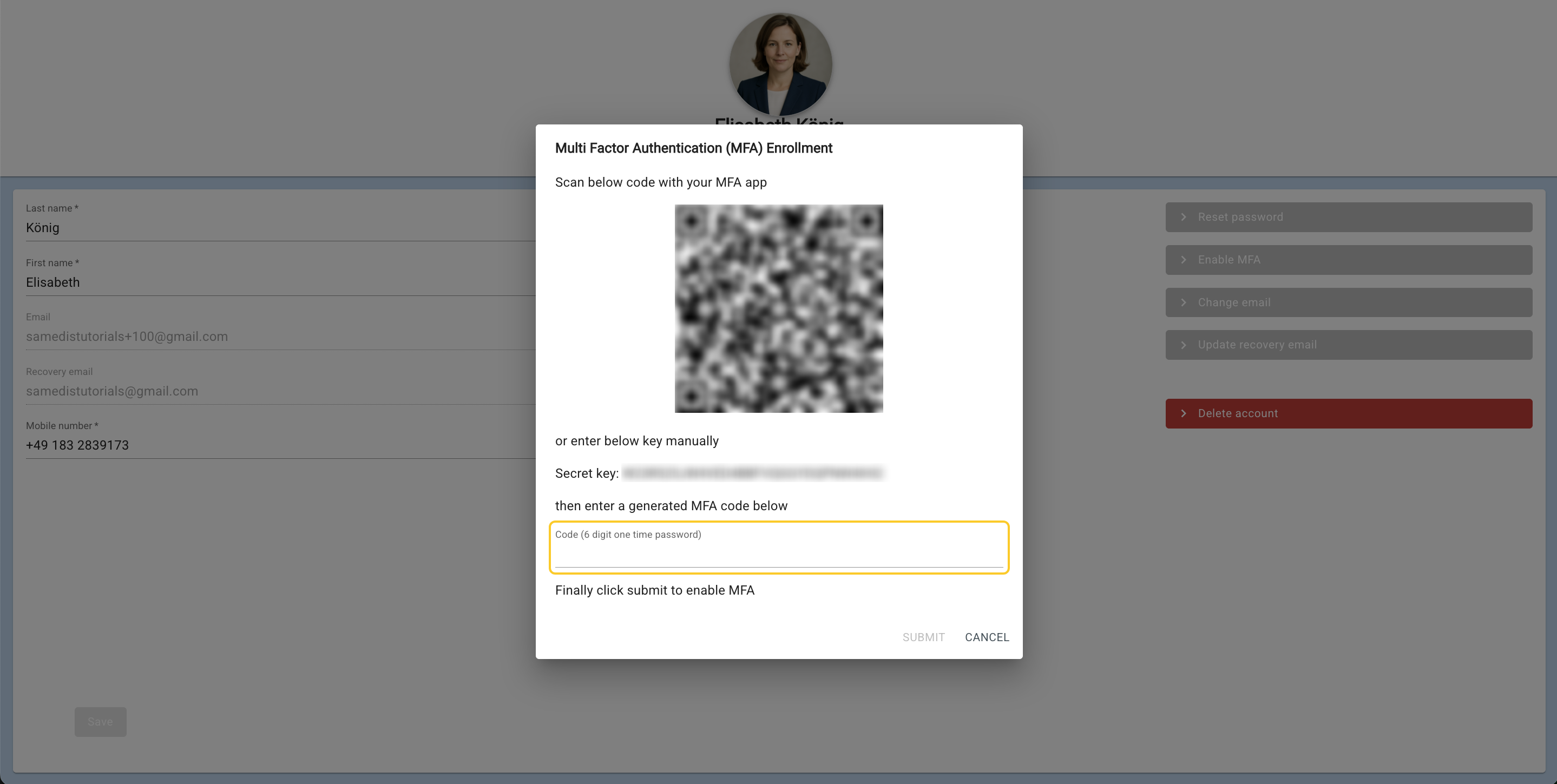 If you want to deactivate MFA, click on Disable MFA and enter the 6-digit code from your app.