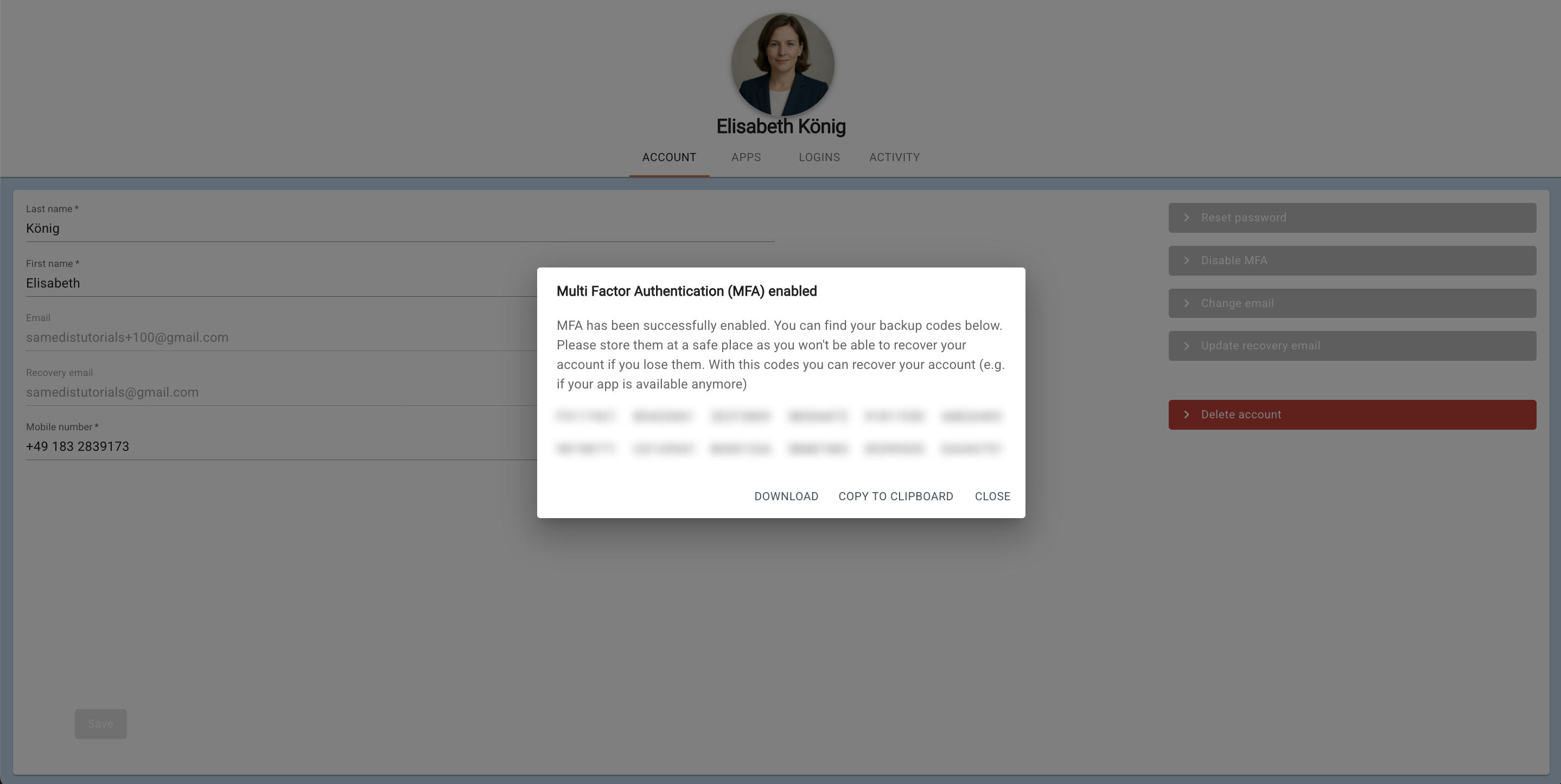 Your backup codes are now displayed. They allow you to recover your account if you lose access to your MFA app. To keep your account secure, download the codes and store them in a safe place.
